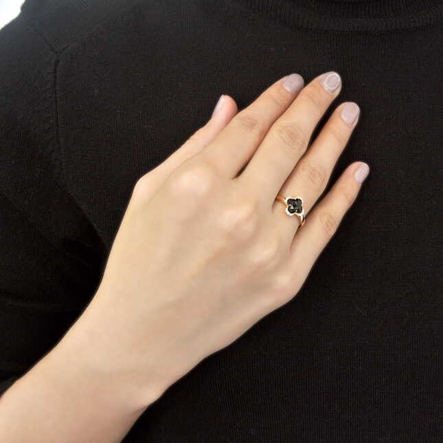 艶めくイエローゴールドにシックな印象のブラックカルセドニーを大人っぽく組み合わせたリング。