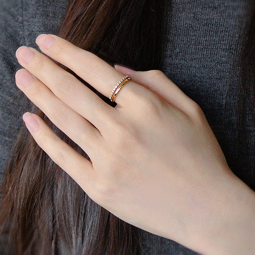 並べることで際立つ2つの異なる輝きを堪能できる、細く美しいラインが上品でモダンな印象のリング。