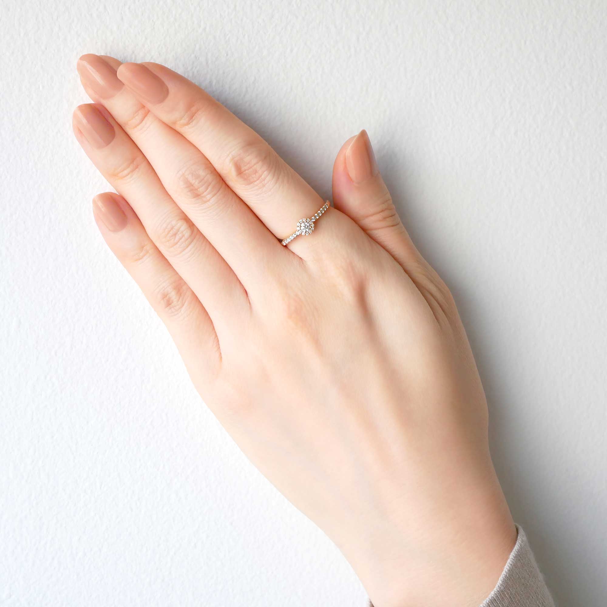 人気のハーフエタニティリングのデザインに、大小のダイヤモンドが光を重ね合ったモチーフは、シンプルな一粒ダイヤモンドリングにはないフェミニンさとエレガントさに満ちています。