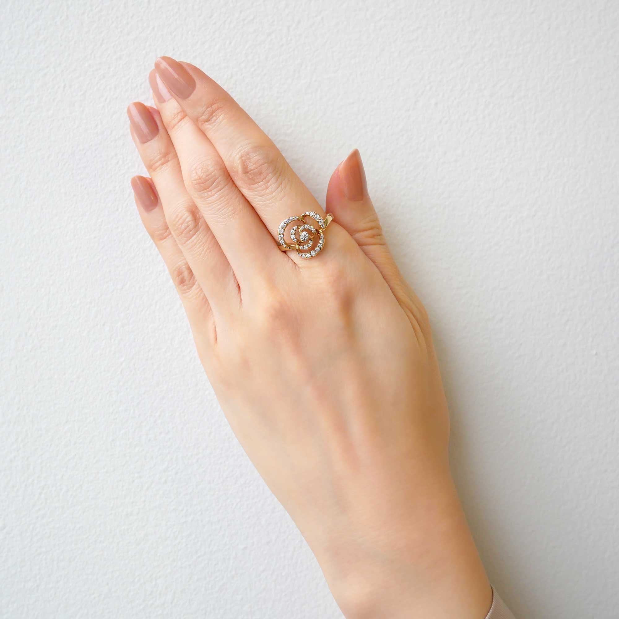 センターに輝くダイヤモンドからふんわりと広がるように描かれた艶めくイエローゴールドのラインは、美しく咲くバラの花びらを縁取るようにセッティングされたダイヤモンドとともに、より一層の輝きを放ちます。