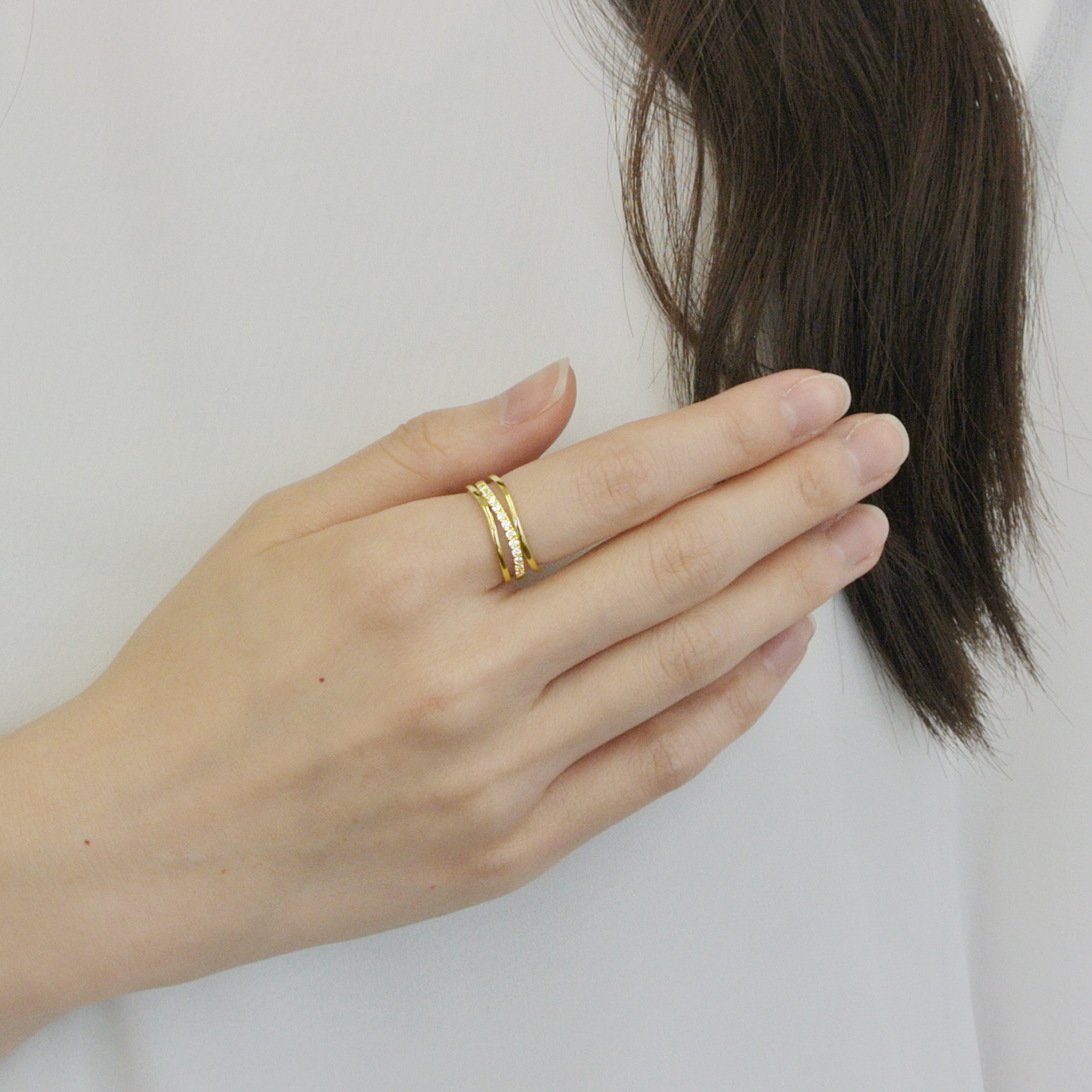 艶やかなイエローゴールドとダイヤモンドの輝きのラインが軽やかに指先を彩る優美なリング。