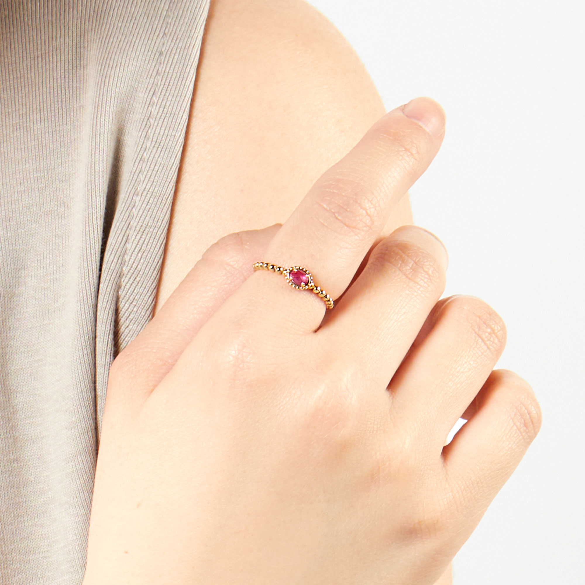 瑞々しいローズカットのルビーとイエローゴールドのコントラストが美しいリング。