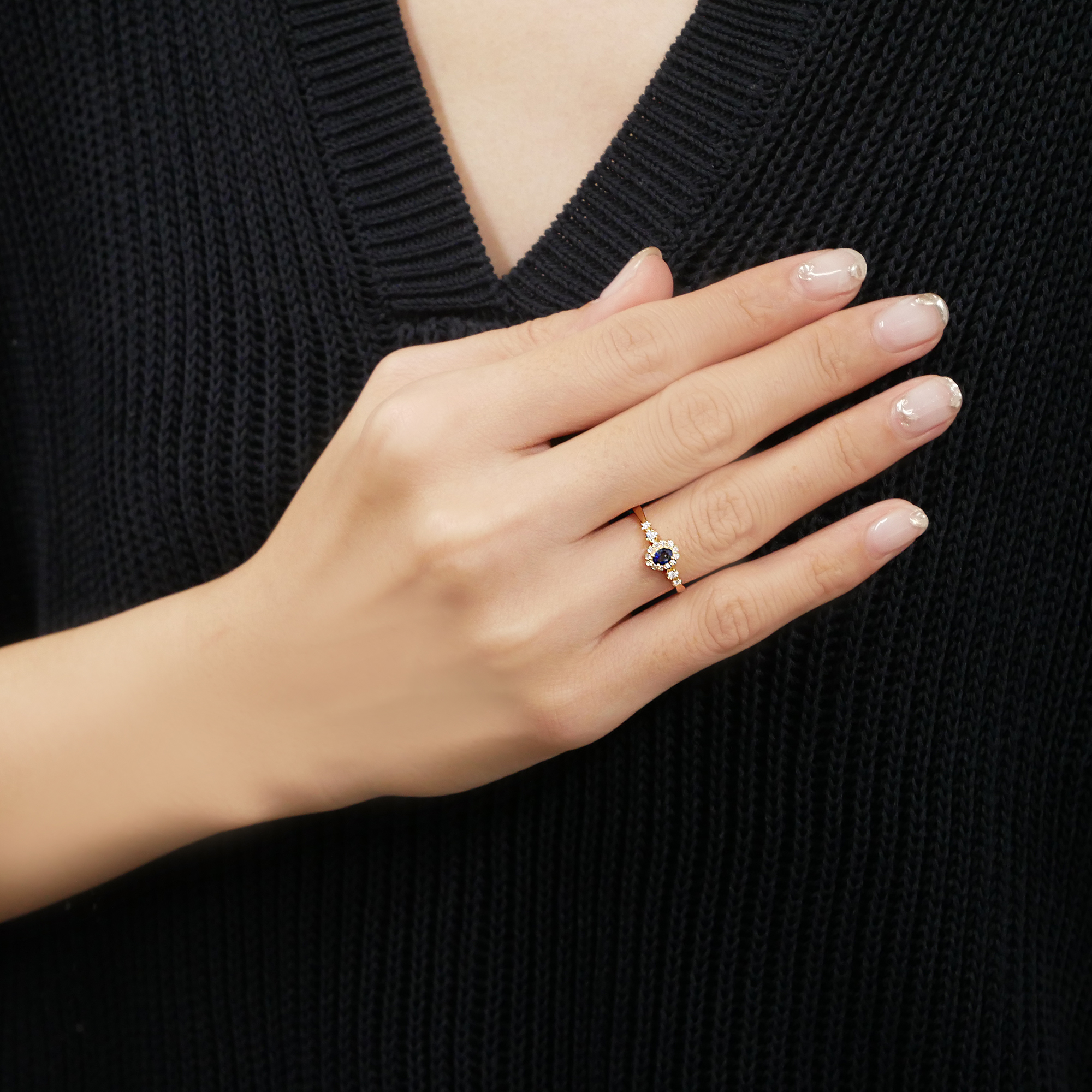 オーバルカットのサファイアをダイヤモンドで縁取った上品で華やかなリング。