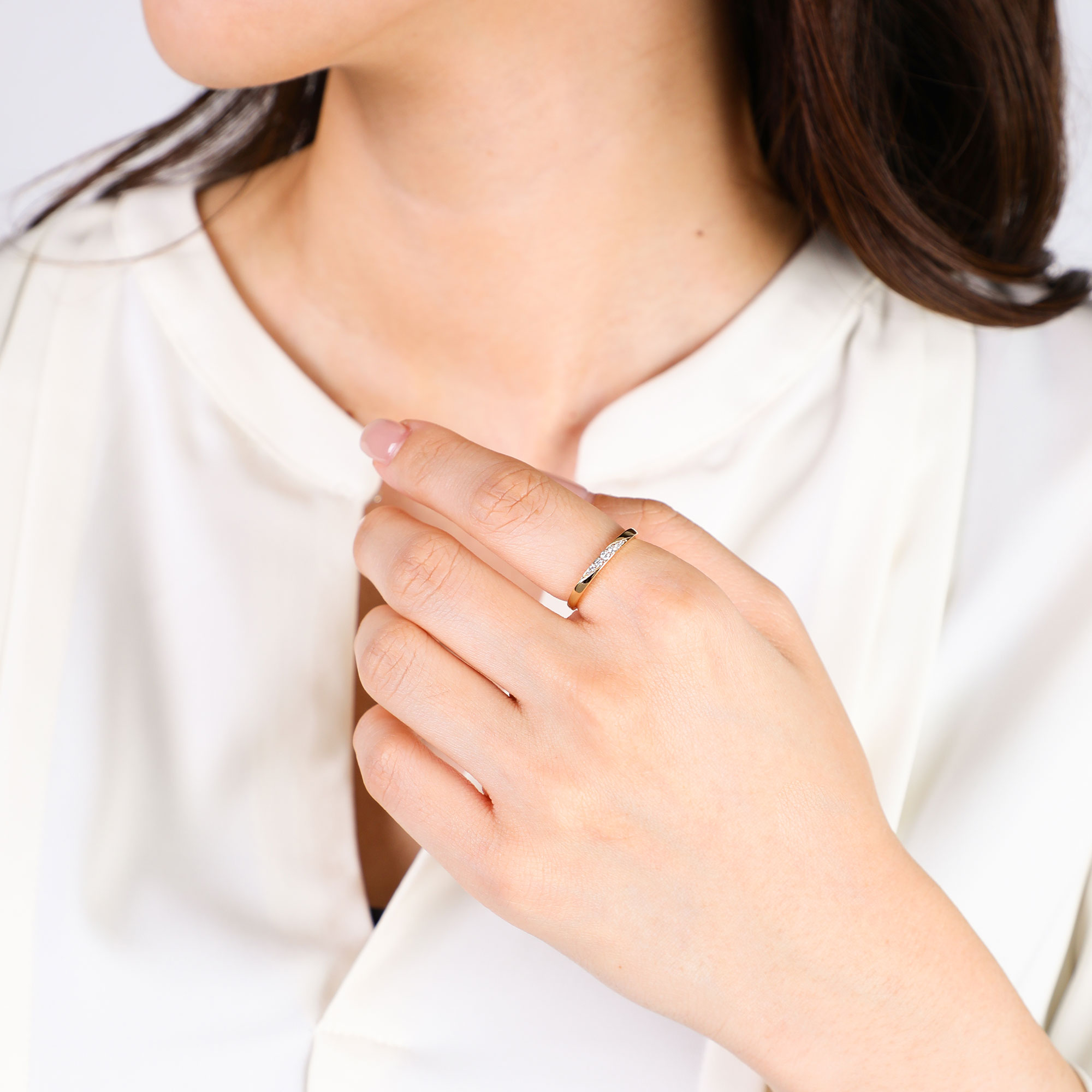 僅かに丸みのある表面の光沢が優しげな印象を与え、緩やかなアングルに配されたダイヤモンドのきらめきが、手元をすっきりと見せます。