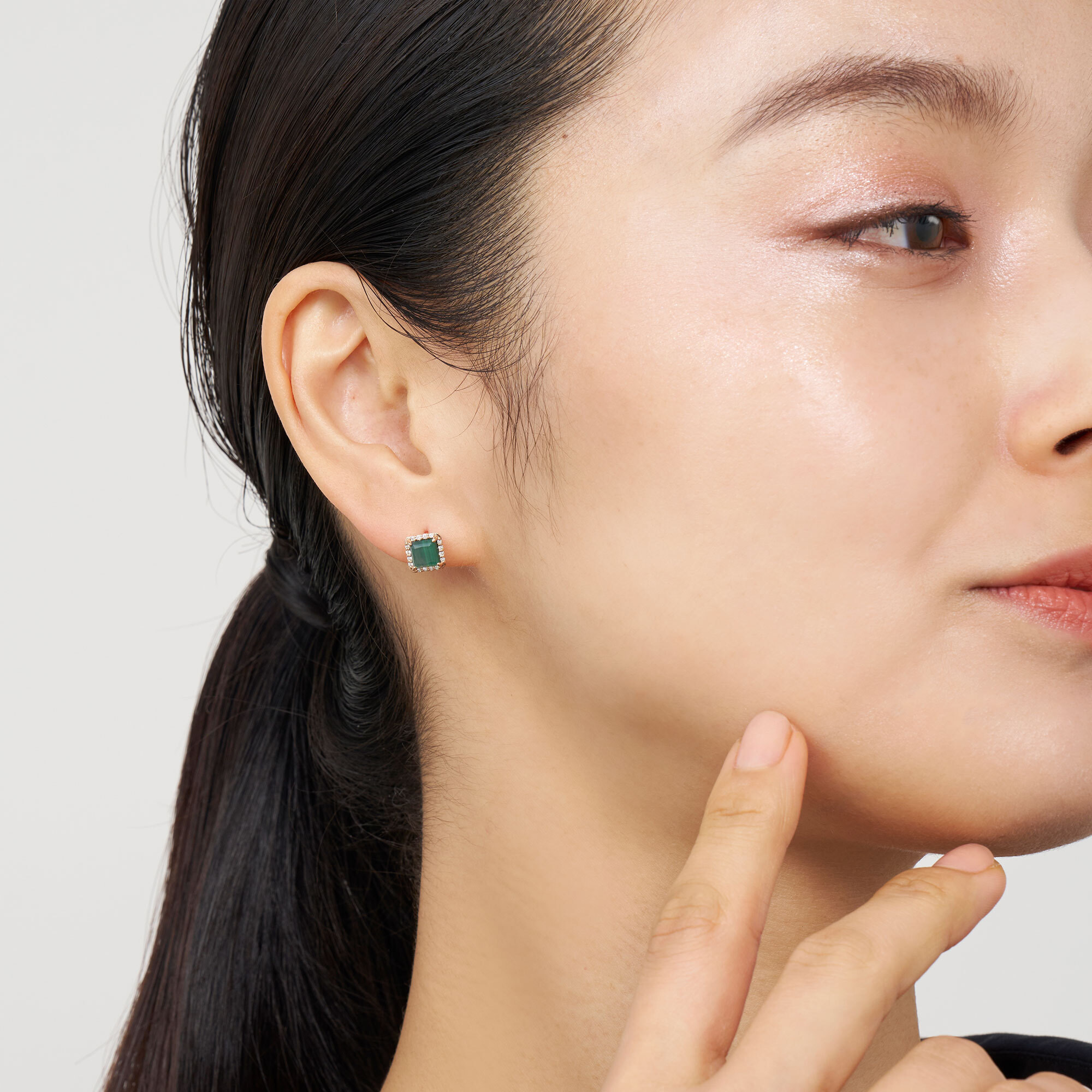 かっちりとしたスクエアモチーフに、メレダイヤの繊細なきらめきとピンクゴールドの艶感で上品な華やぎをプラス。女性らしいけれど甘過ぎない、大人の表情のジュエリーです。