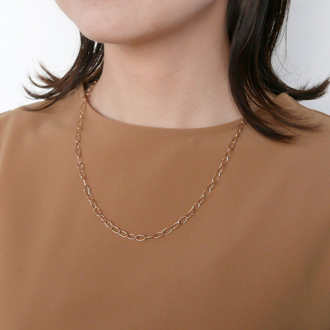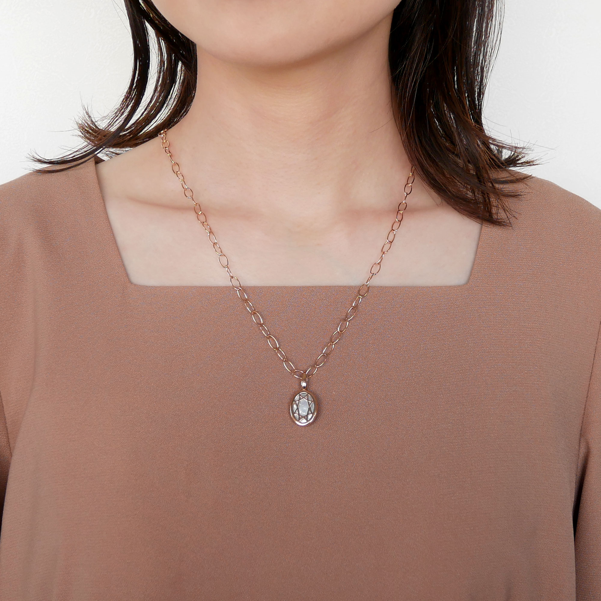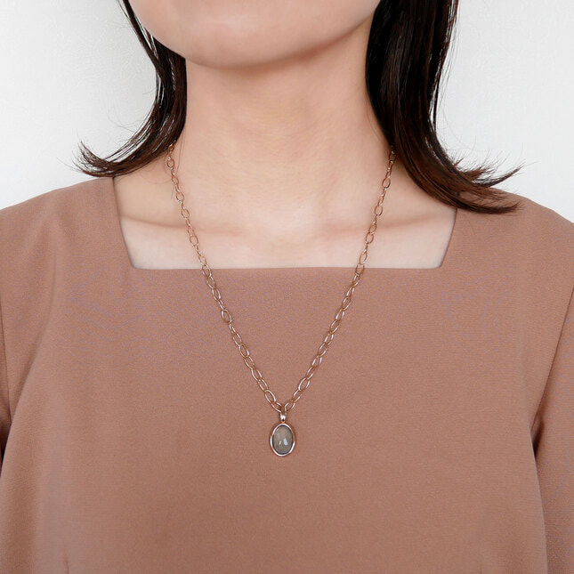 トップはチェーンから取り外せるので、チェーンだけでもお使いいただけ、両面での使用が可能な万能ネックレスです。