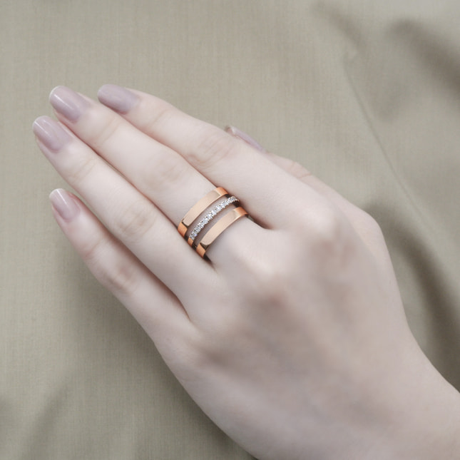 幅広のゴールドの中央をダイヤのラインが帯留めのように引き締め、肌をのぞかせる絶妙な空間の取り方は日本らしい絶妙なバランス。