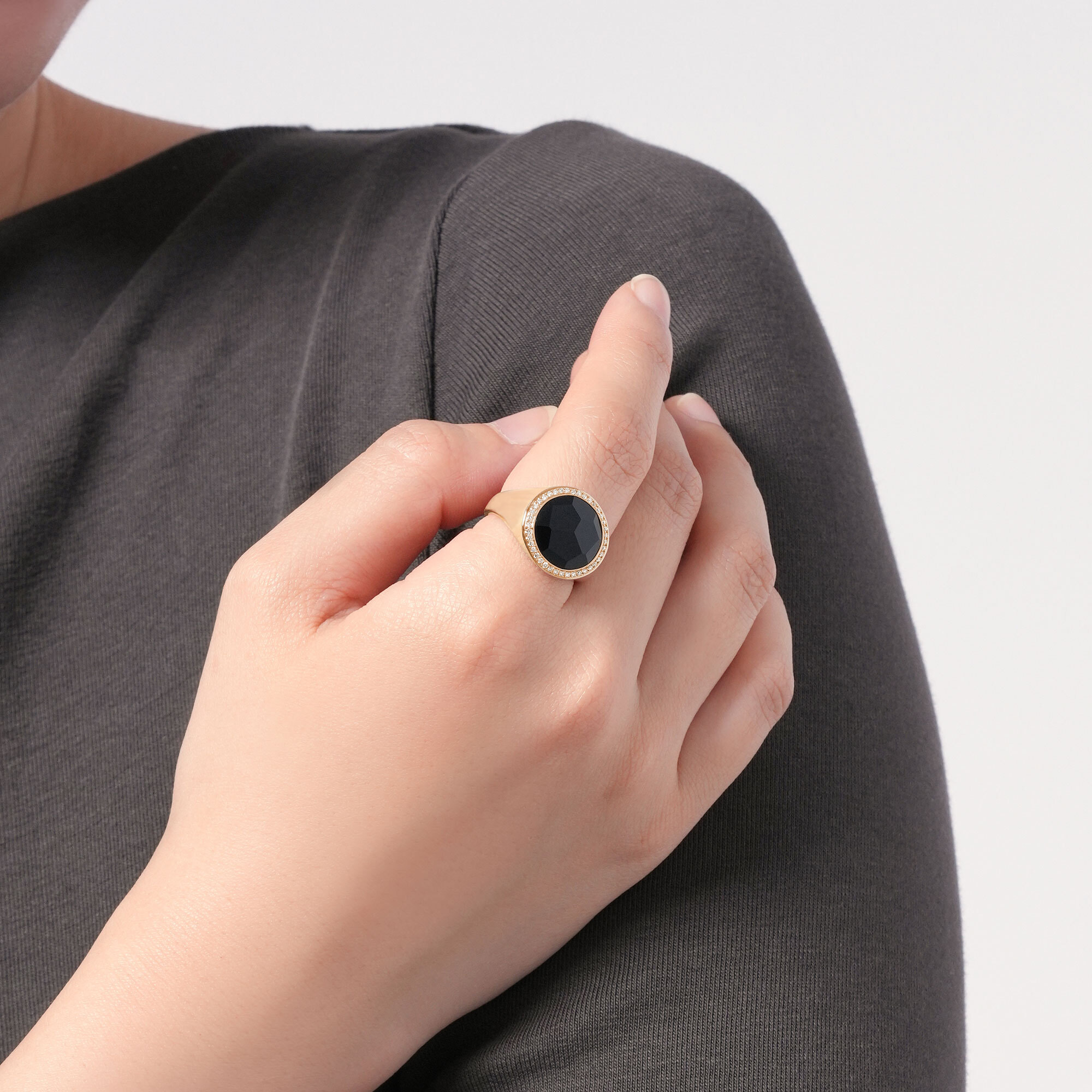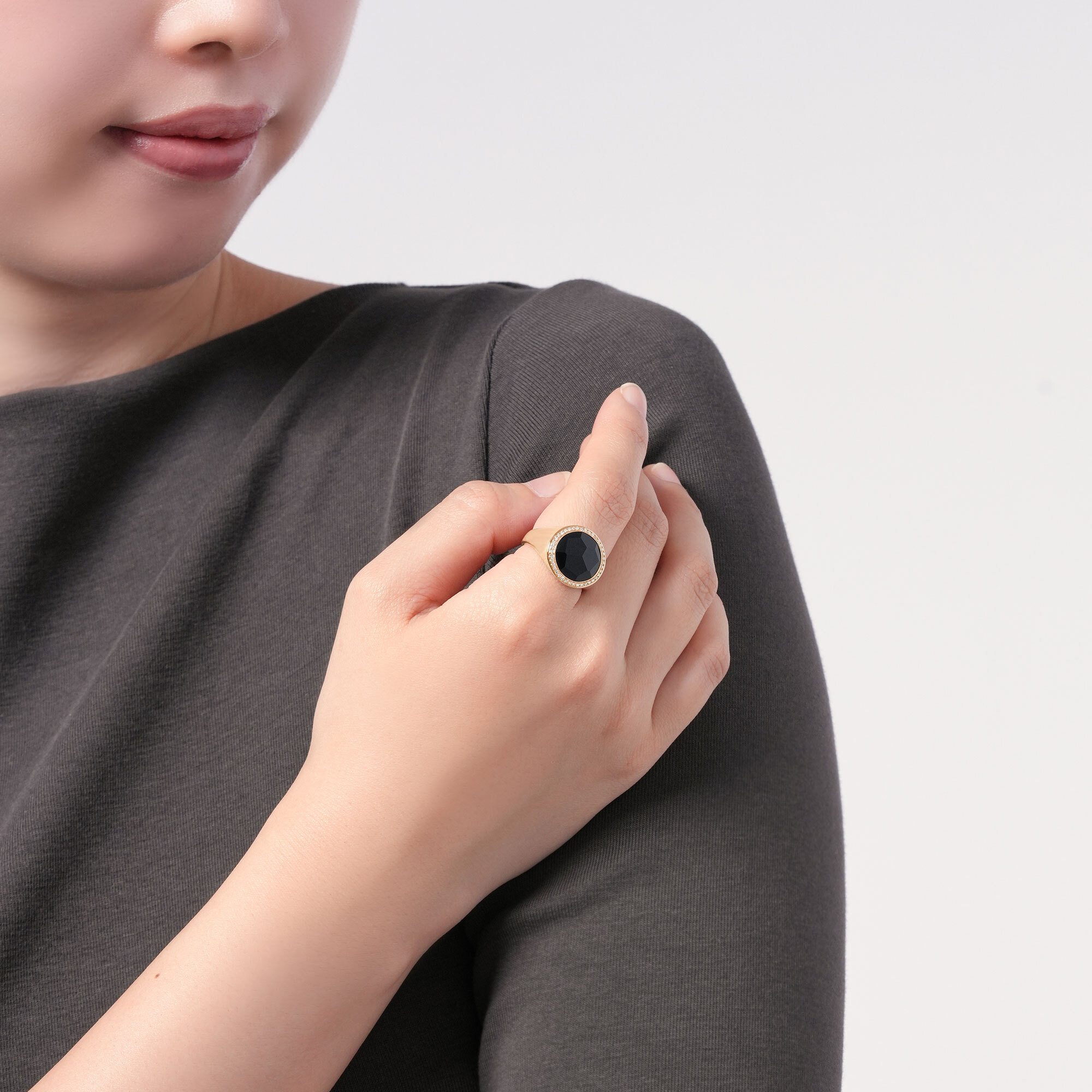 ランダムカットが施された漆黒のブラックカルセドニーを、メレダイヤで隙間なく取り巻いたリング。