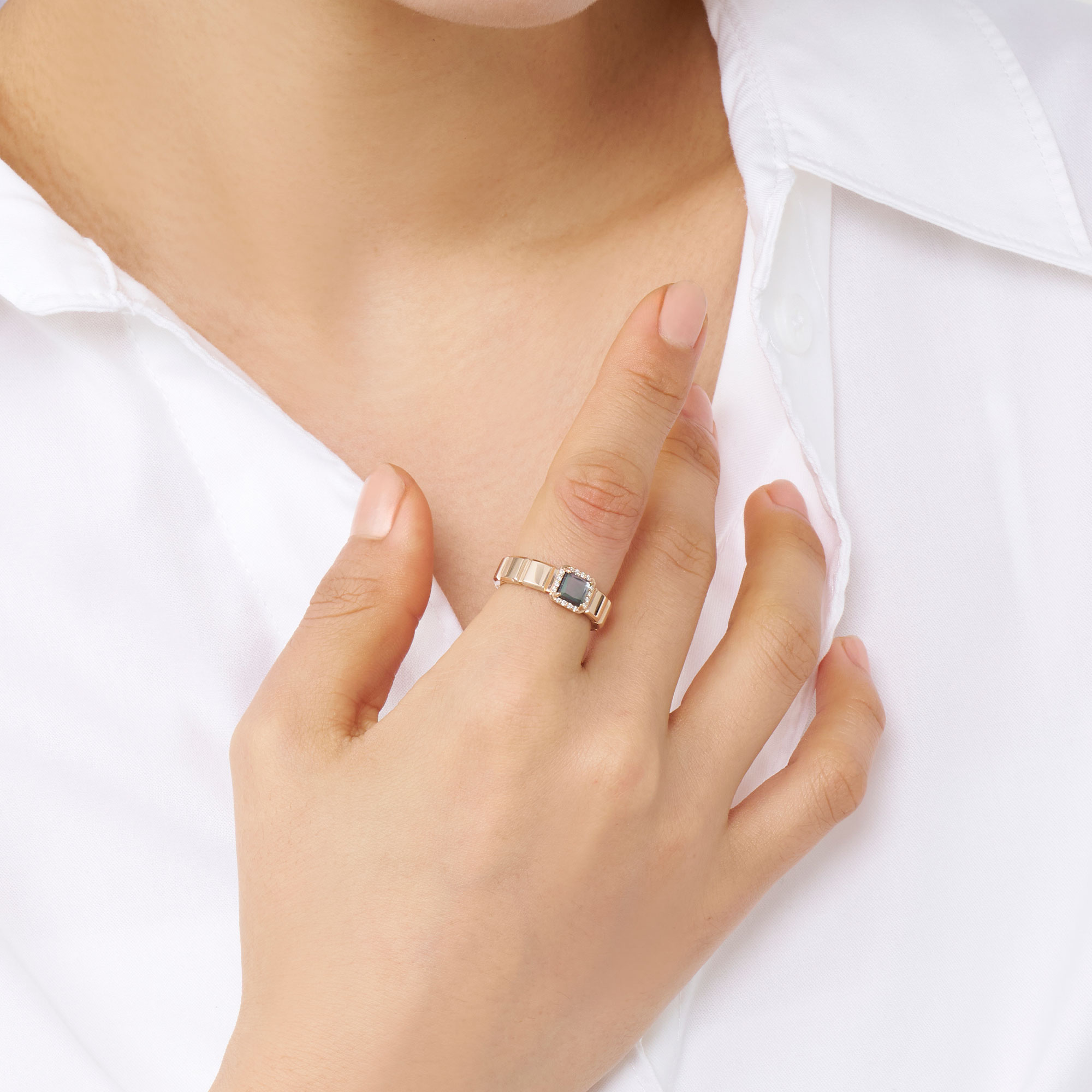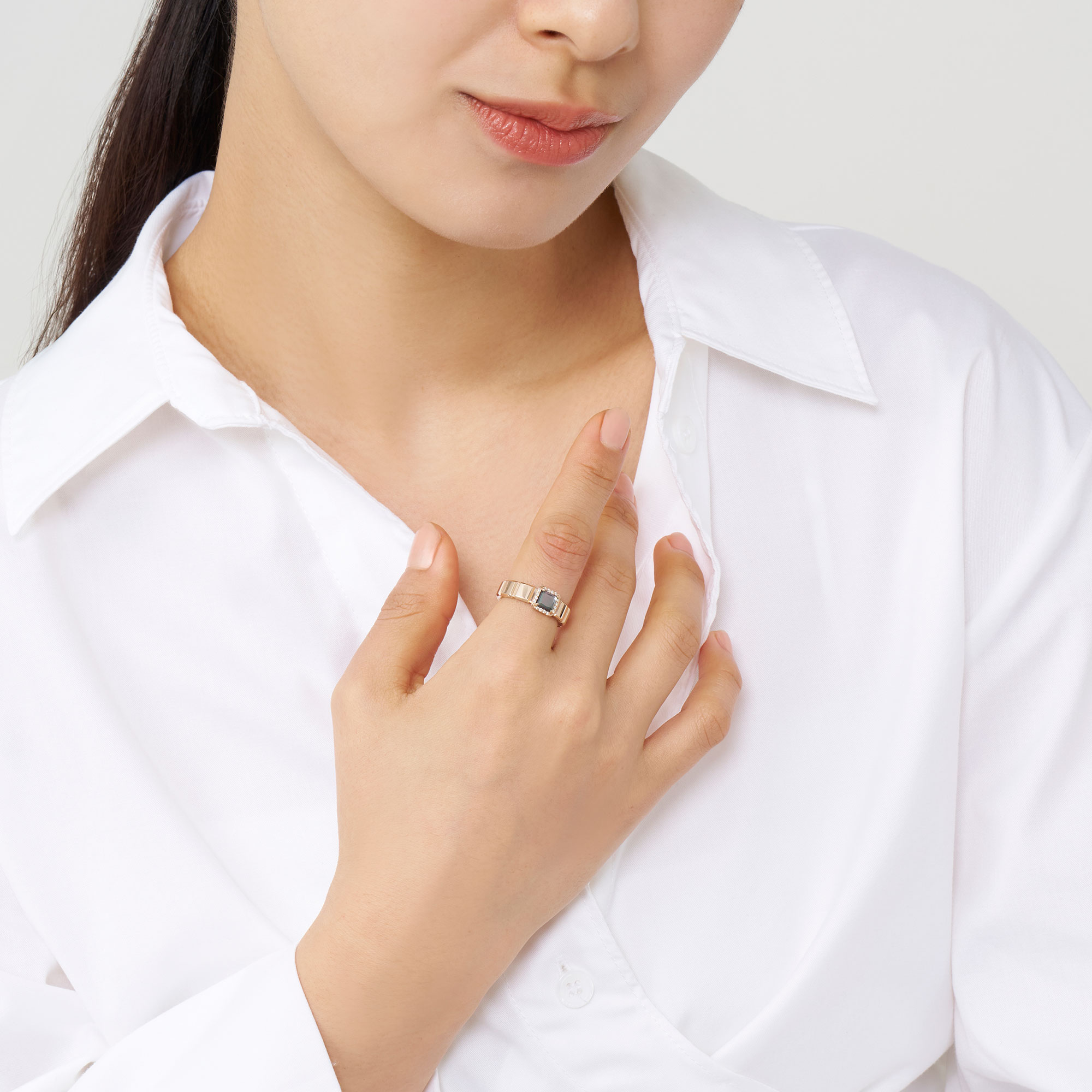 ブラックシェルとスイスブルートパーズを重ね合わせた、虹色のニュアンスを帯びたダークブルーカラーが印象的なリング。見る角度によって変化する様々な輝きに神秘的な空気が漂います。