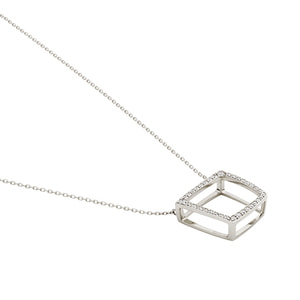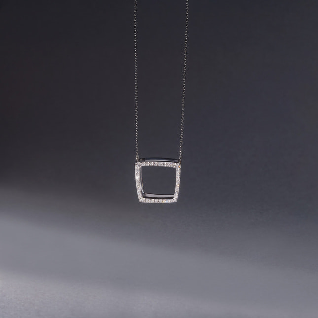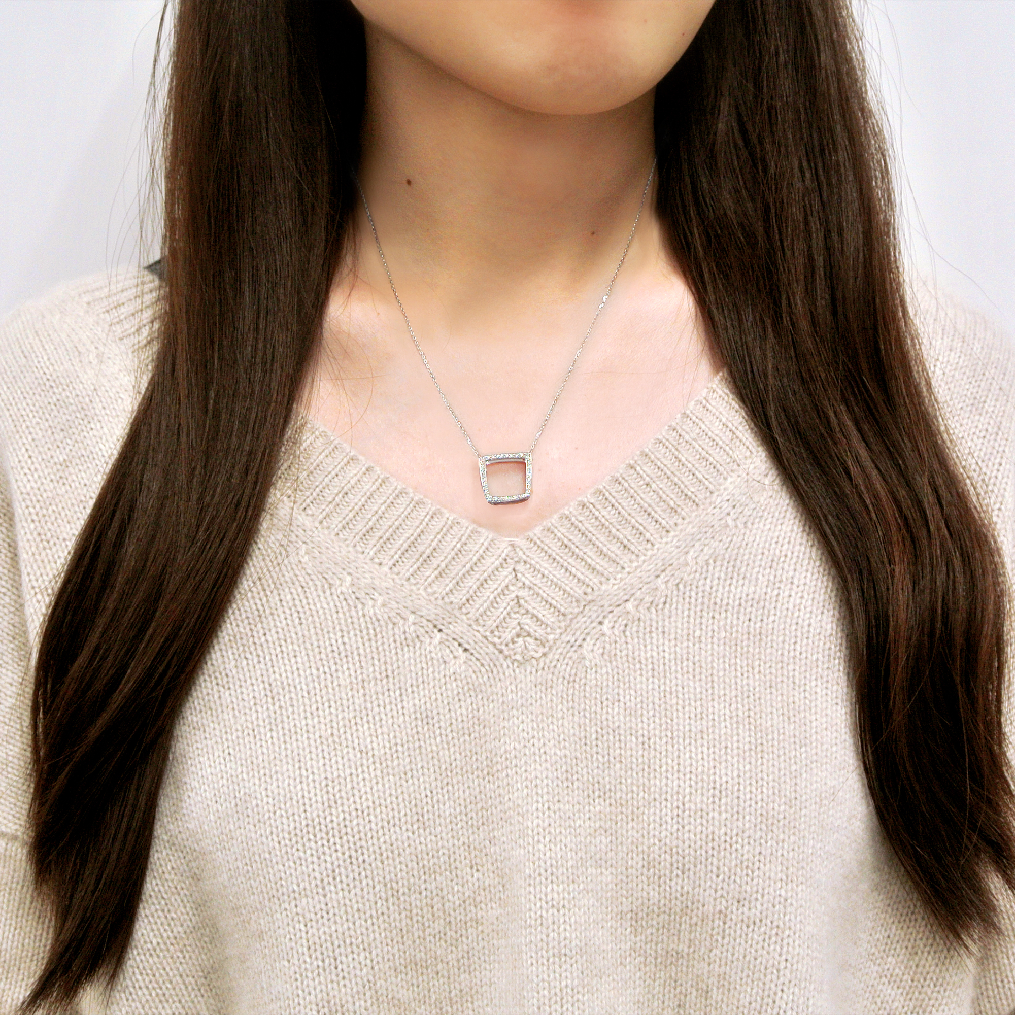 きりりとしたホワイトゴールドに配された大小のダイヤモンドが煌めき、シャープなラインながらも女性らしい印象を与えるネックレスです。
