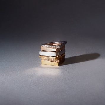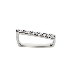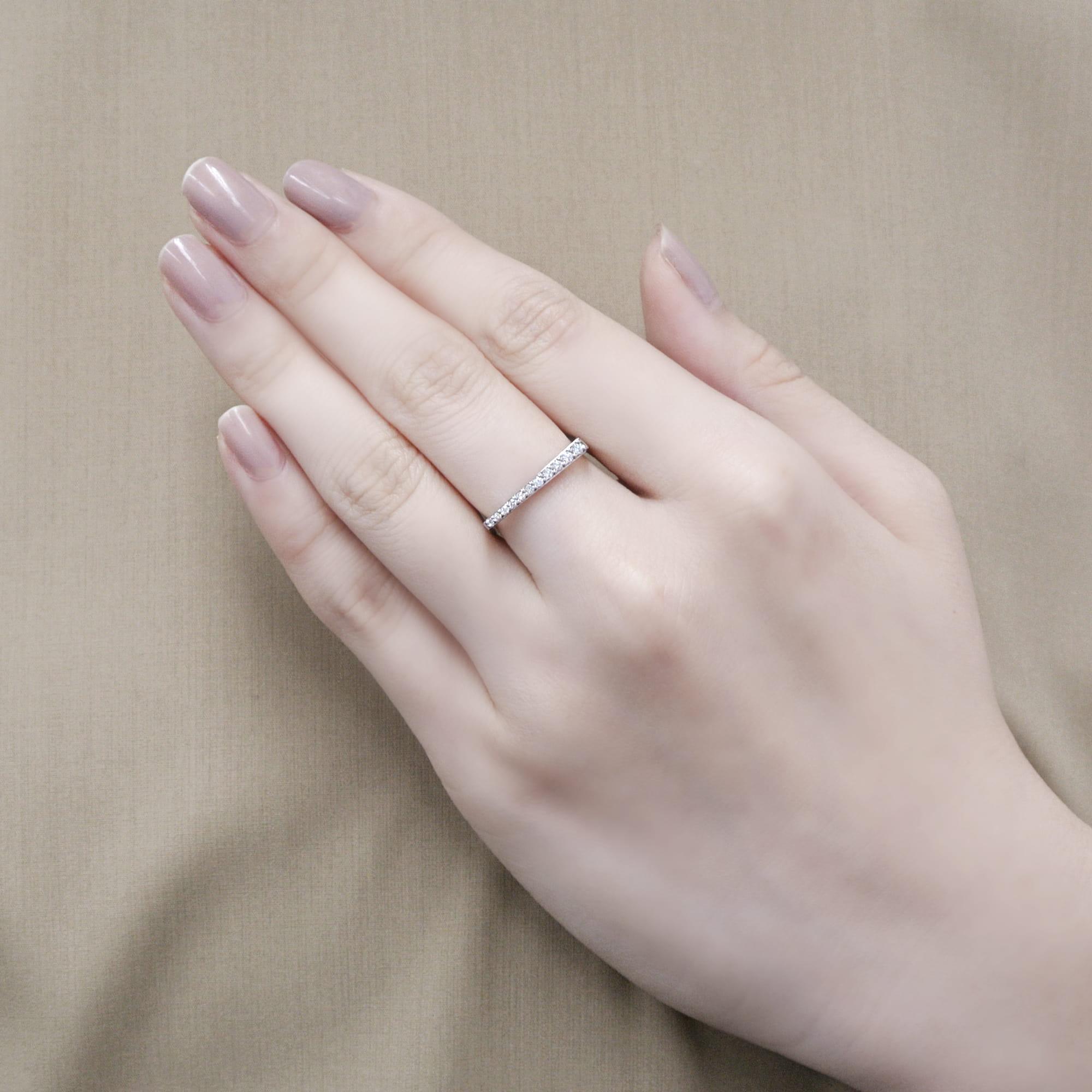 どんなシーンにも合わせやすいホワイトゴールドは、大小のダイヤの様々な煌めきを落ち着いた大人の印象にまとめてくれます。ななめのラインは指を長く、ほっそりと美しく見せてくれる効果があります。