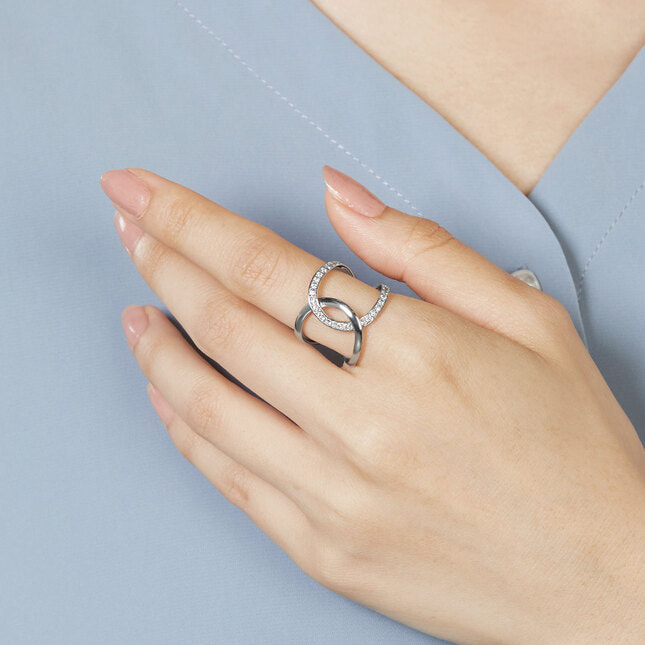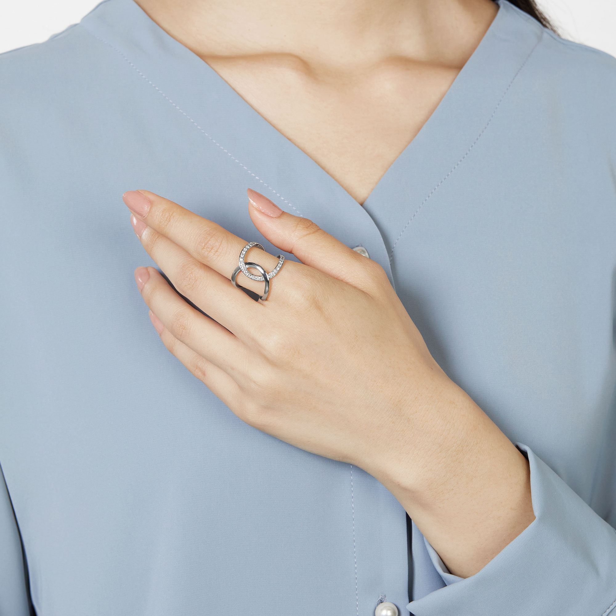 ふたつの輪が一瞬でつながった場面をとらえたような立体的なフォルムと、滑らかな着け心地がポイントです。