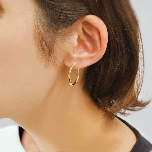 たっぷりとした地金の重厚感と内側へ緩やかにひねりを加えたラインが、シンプルなフープと違い正面から見ても奥行きが感じられ顔まわりに立体感を生みます。