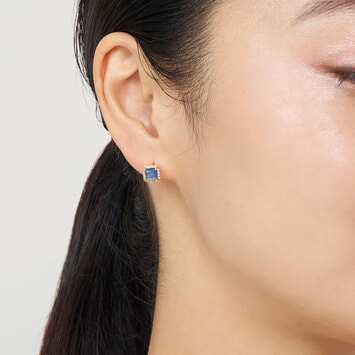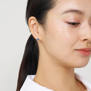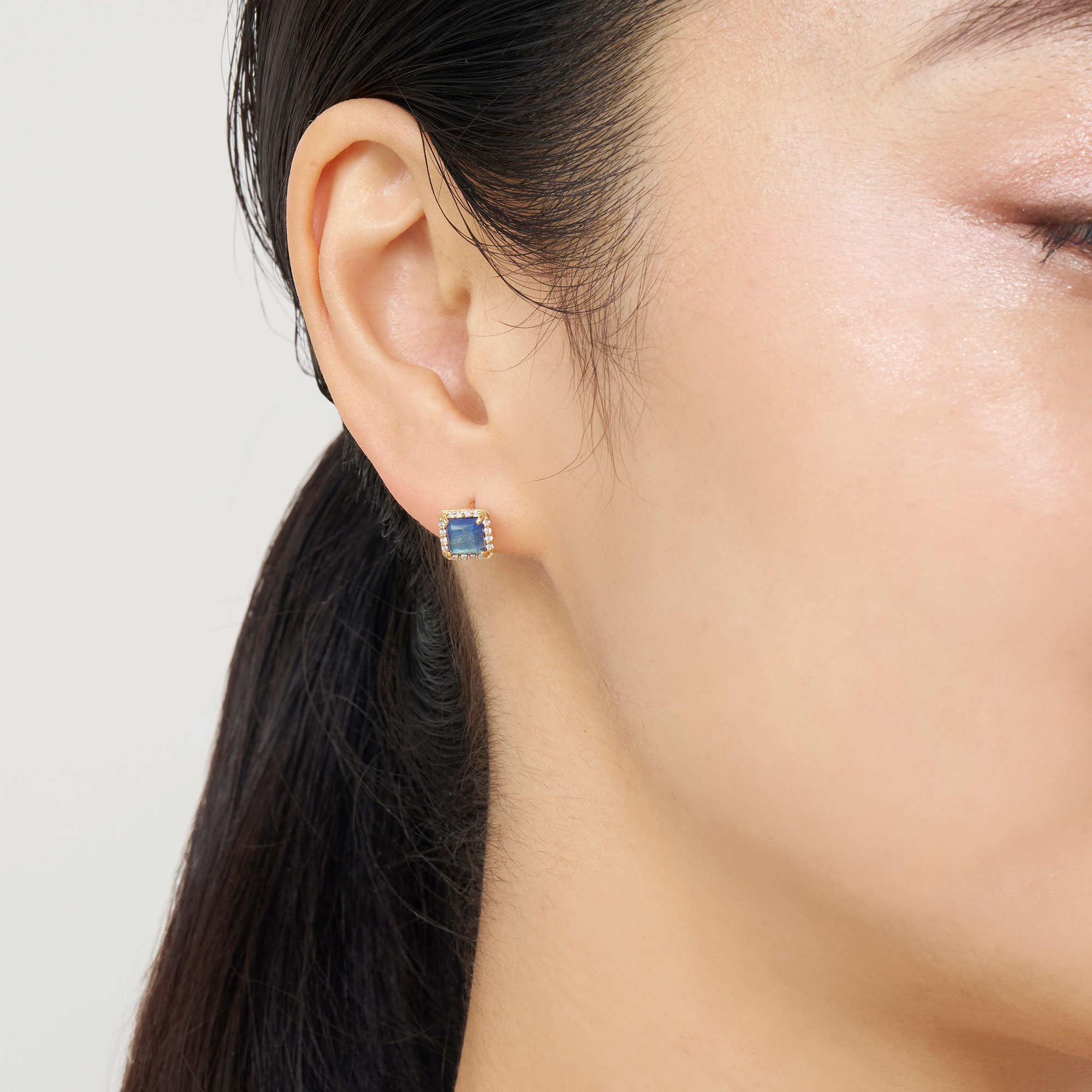 ラピスラズリにラブラドライトを重ね合わせた、深いニュアンスのあるブルーカラーが印象的なピアス。見る角度によって変化する様々な輝きに神秘的な空気が漂います。