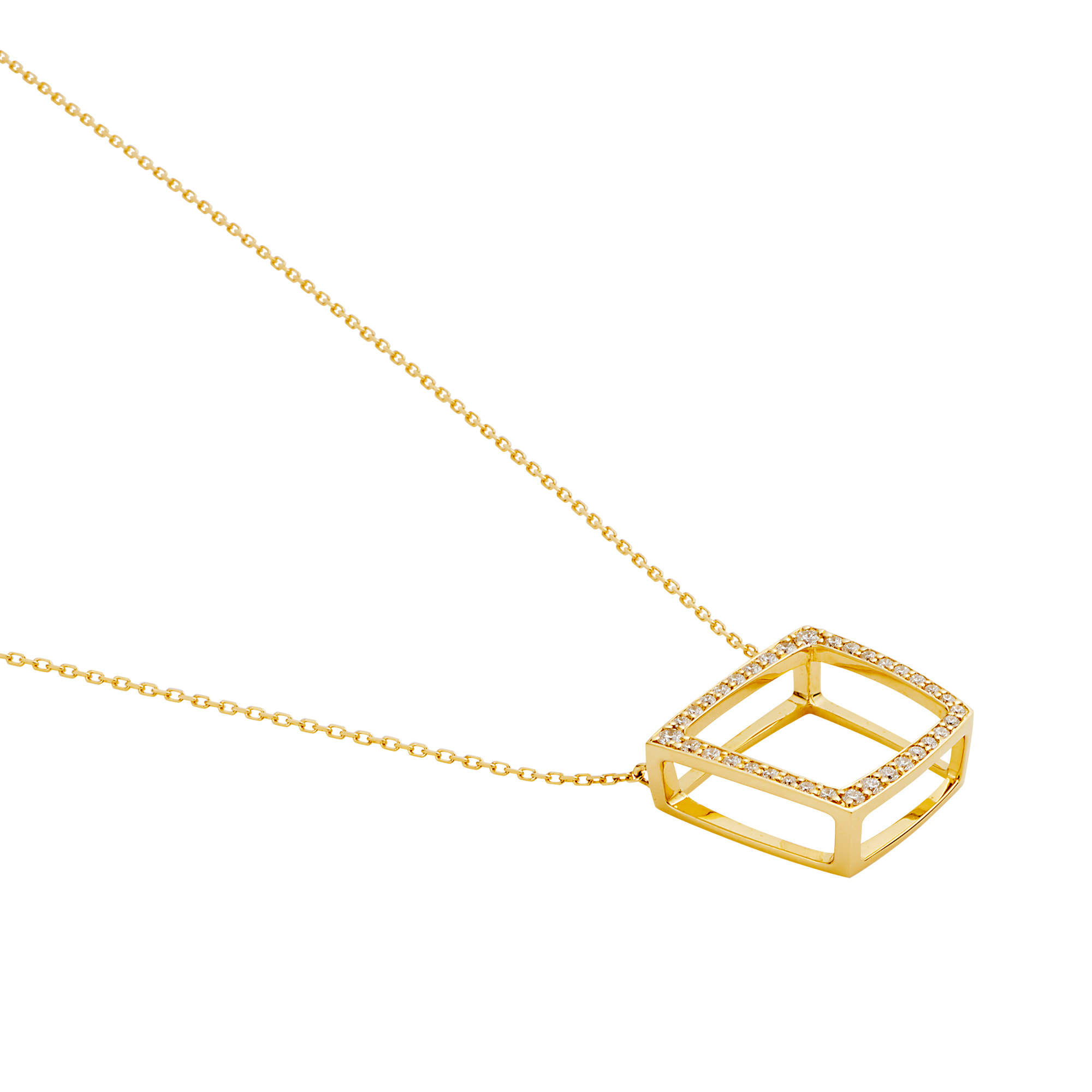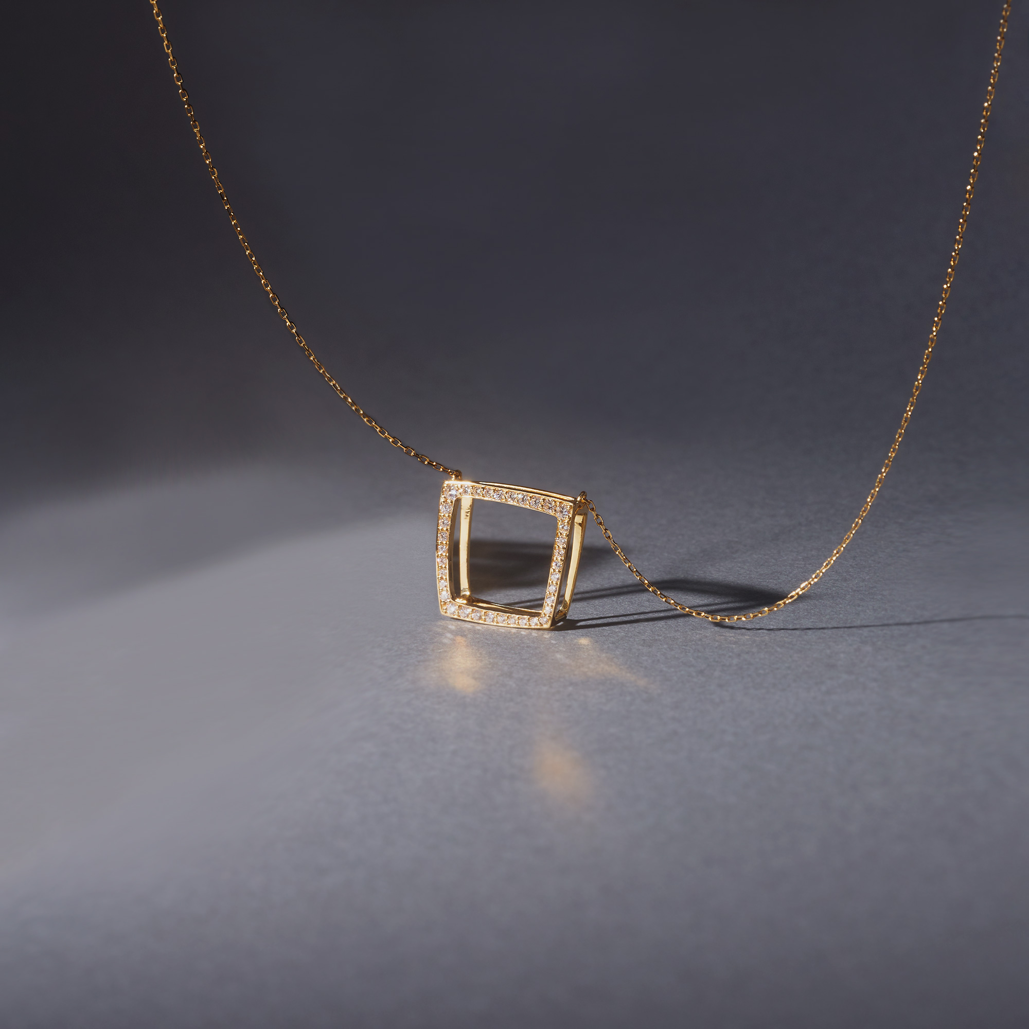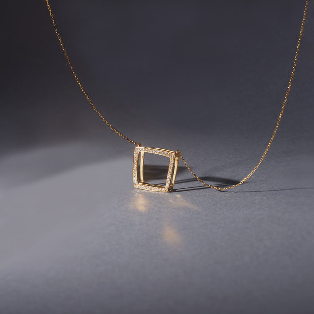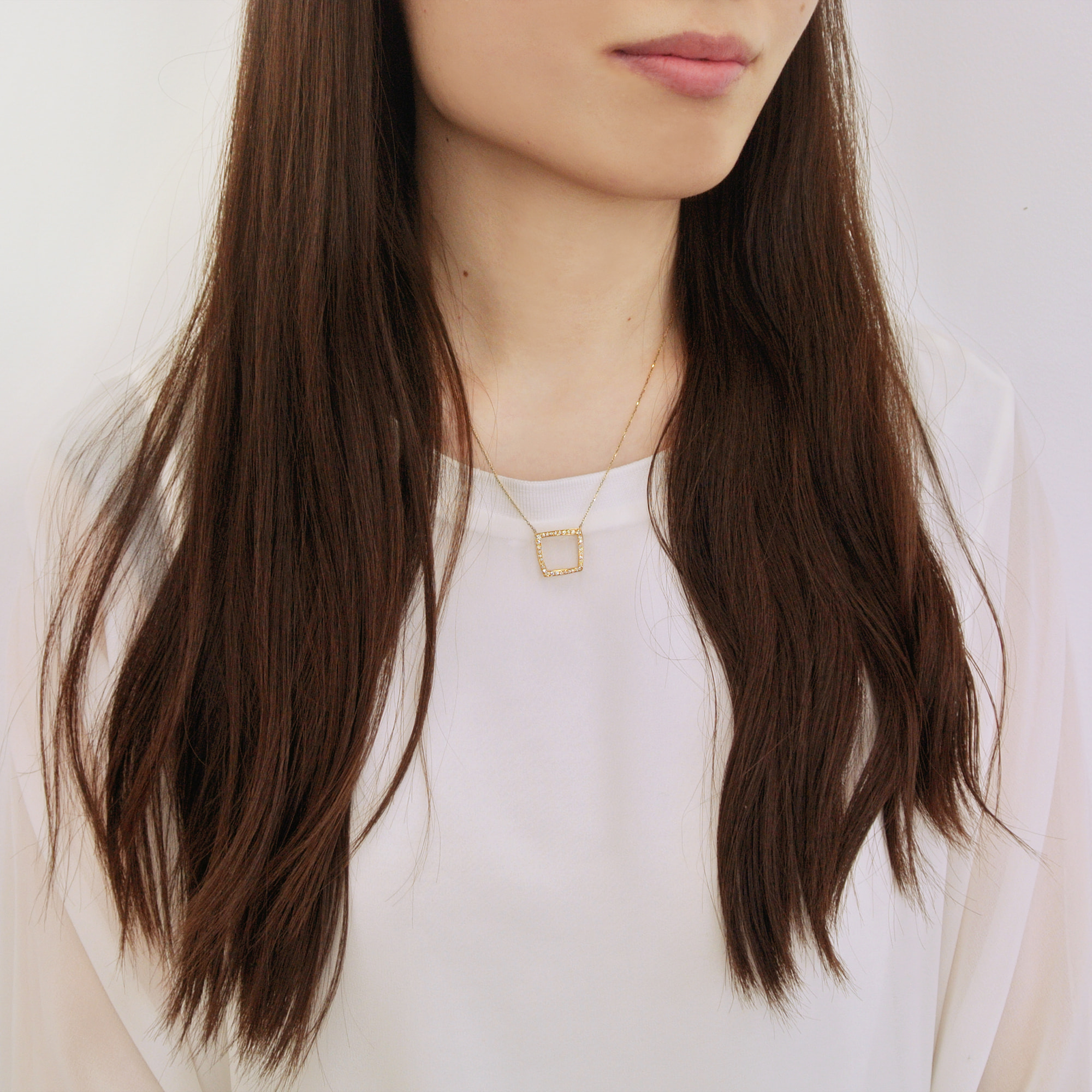 華やかなイエローゴールドに配された大小のダイヤモンドが煌めき、シャープなラインながらも女性らしい印象を与えるネックレスです。