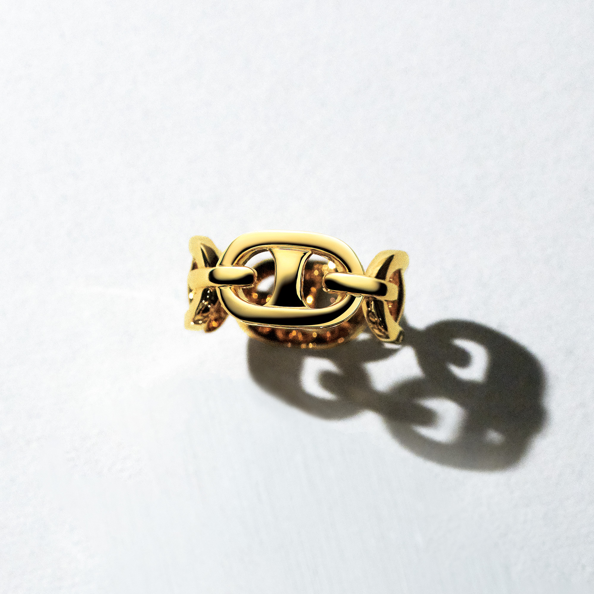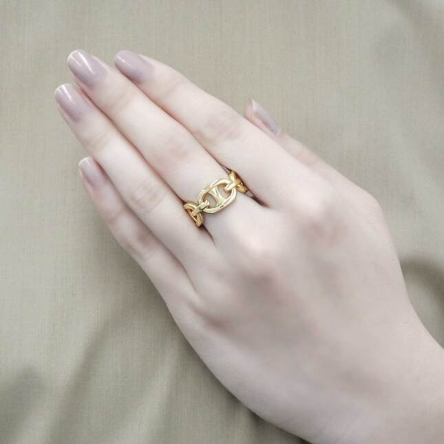 程よい重厚感が指にしっくりとなじみ、ゴールドの艶感と上品な華やぎとともに満足感を与えてくれるリングです。