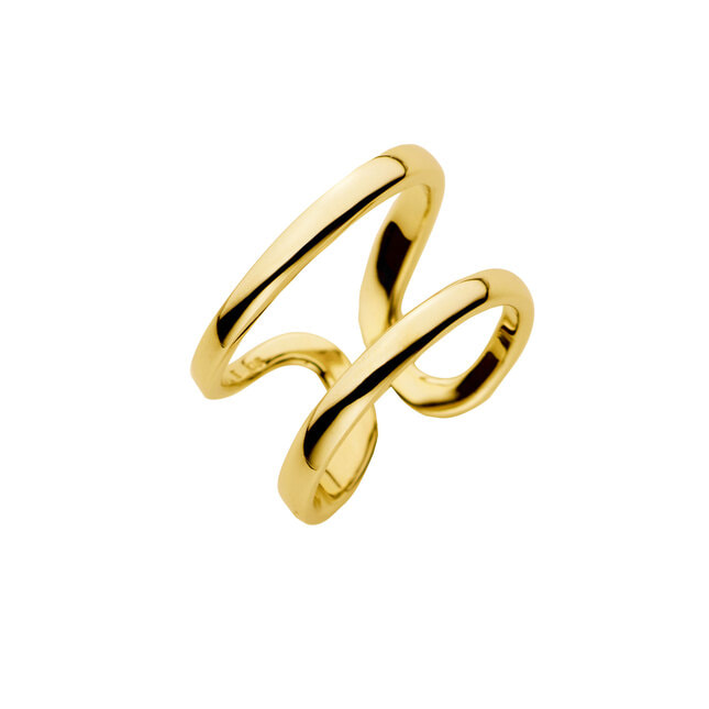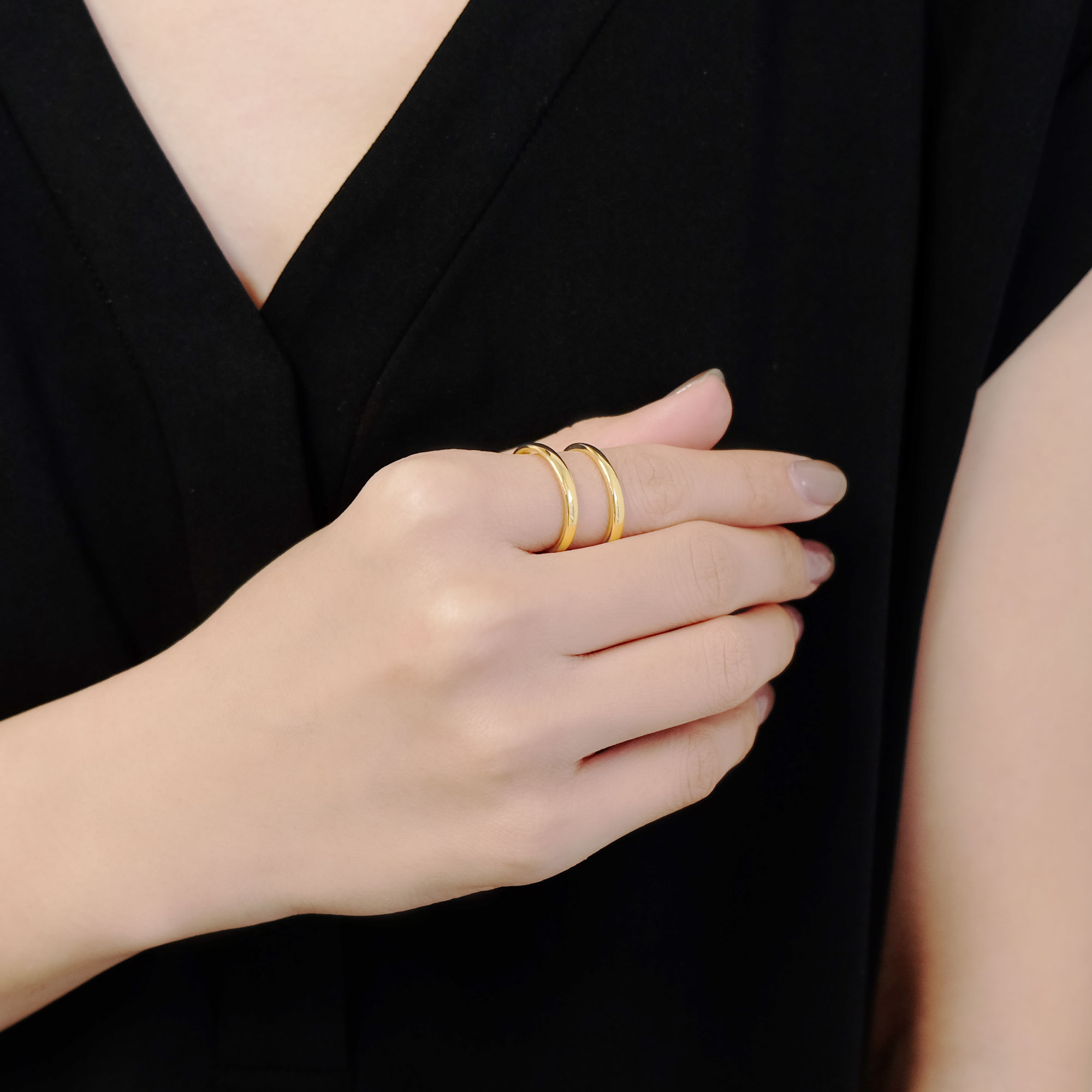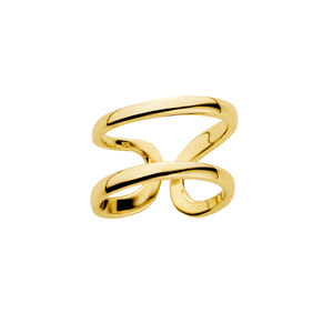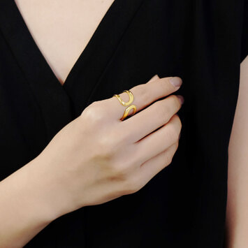 滑らかな光沢のイエローゴールドがしっとりと指に馴染むリッチな着け心地と、大胆な空間使いは抜け感をプラス。