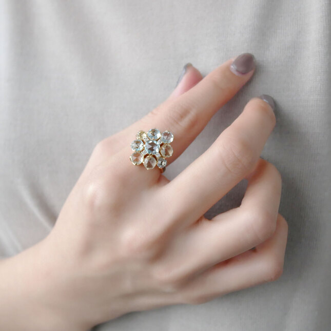 ローズカットの踊るようなきらめきが指いっぱいに広がるカラフルで大胆なデザインも、淡い色調と透明感で品よく軽やかな印象の仕上がりです。