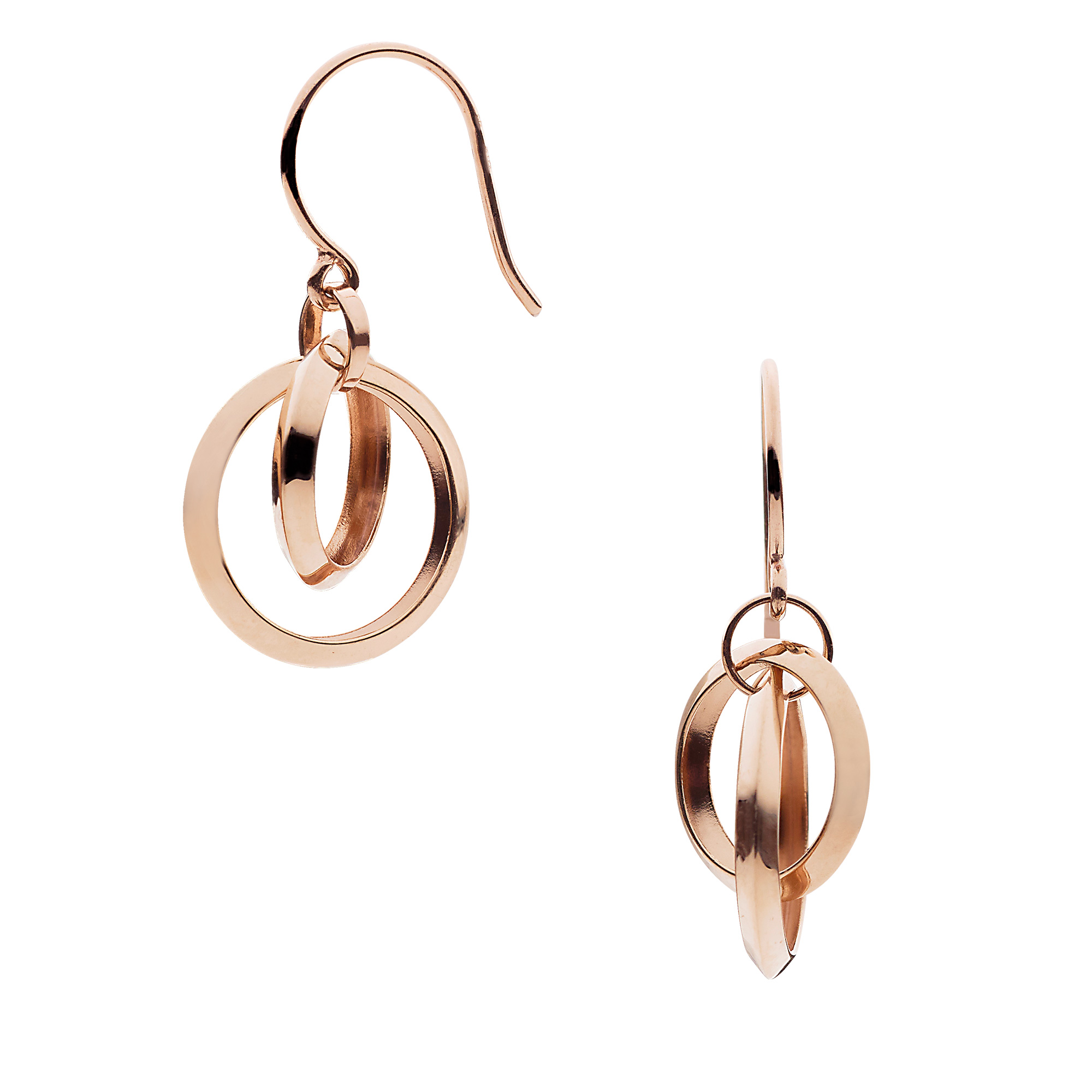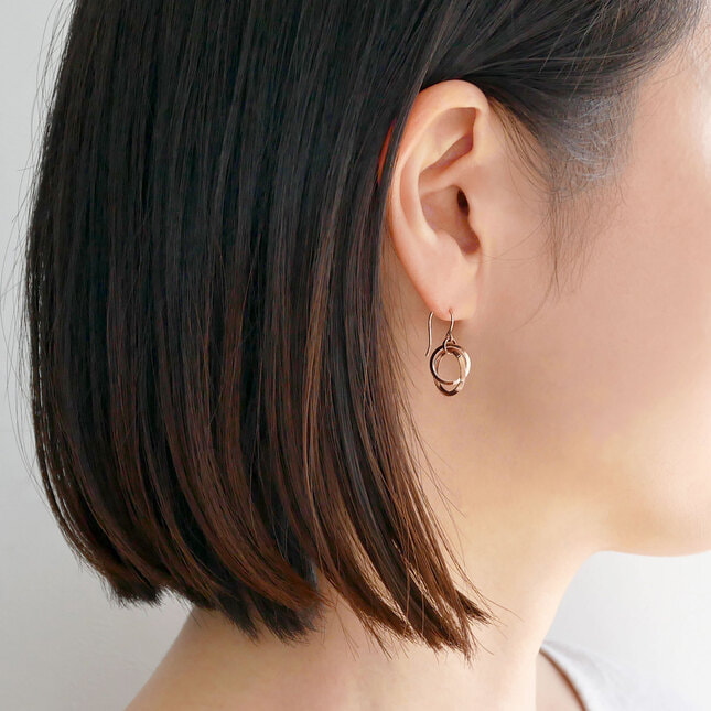 2つのサークルモチーフを組み合わせたスイングタイプのピアス。