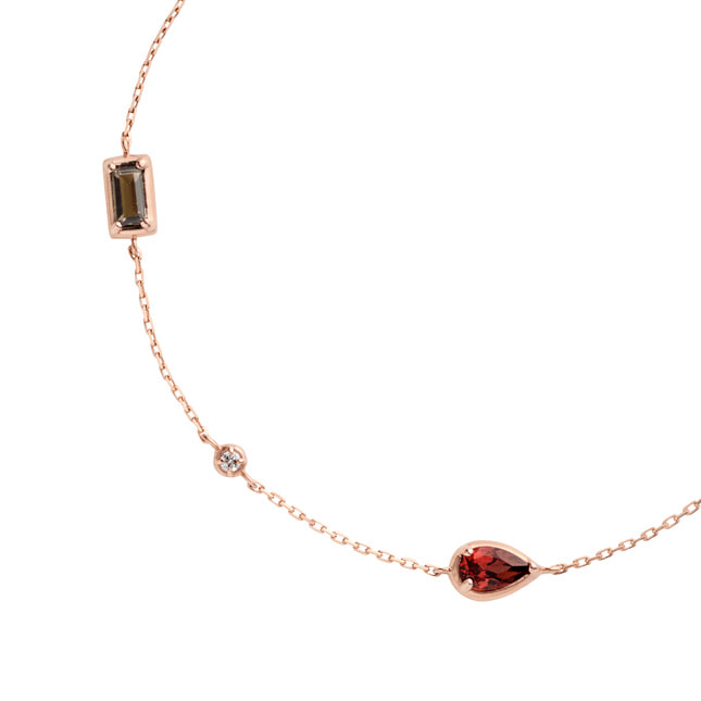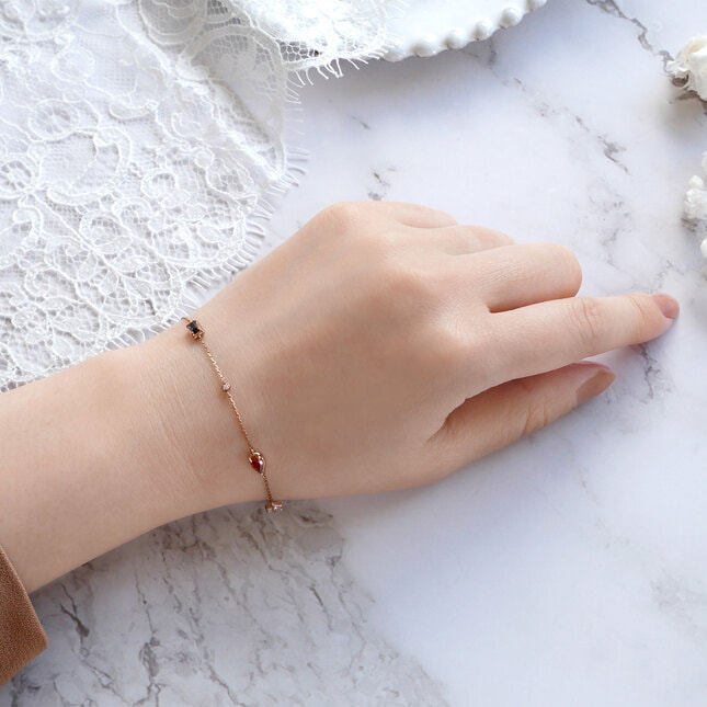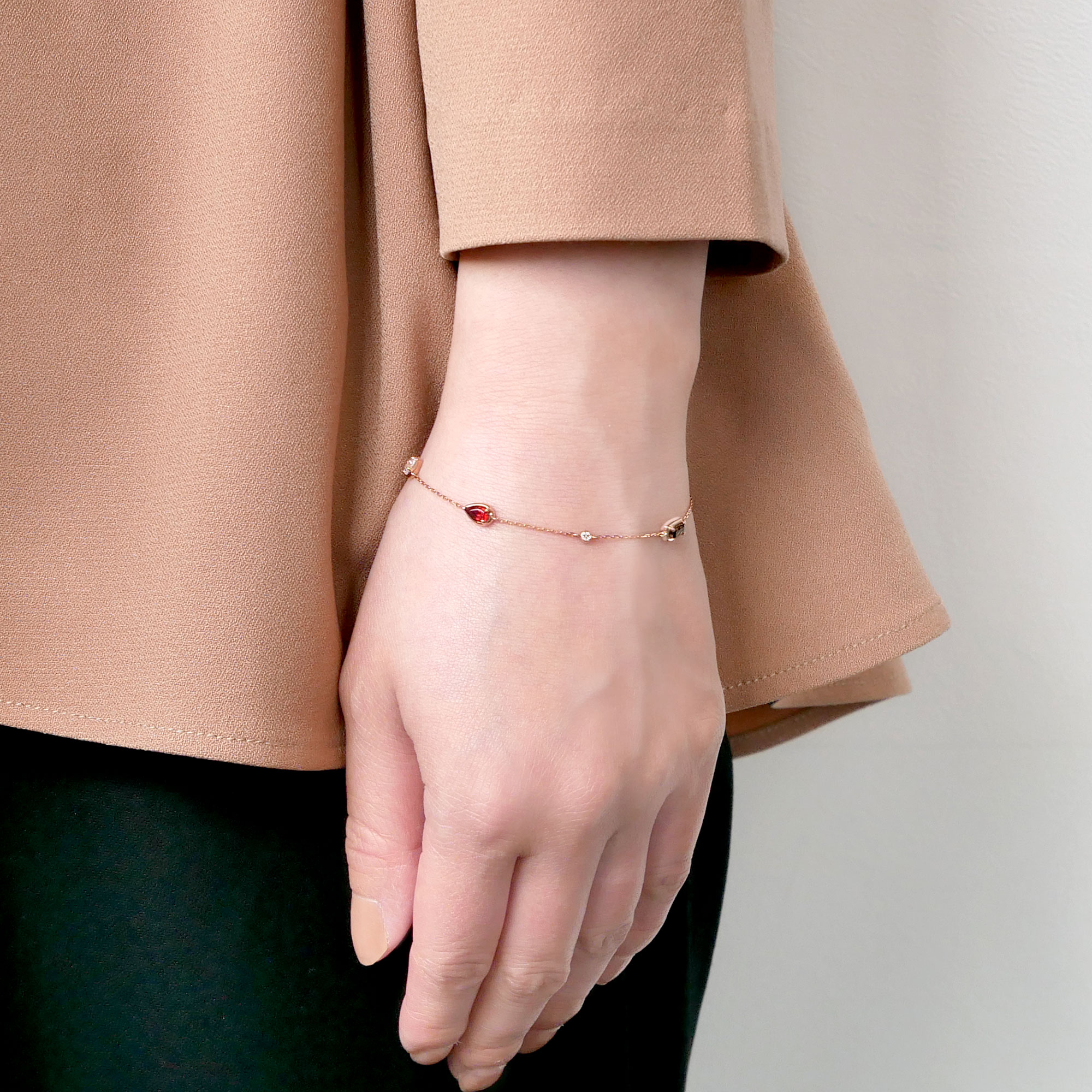 艶めくピンクゴールドに、ホワイトやブラウン、レッドのシックな色味の組み合わせが美しい、カラーストーンのブレスレット。