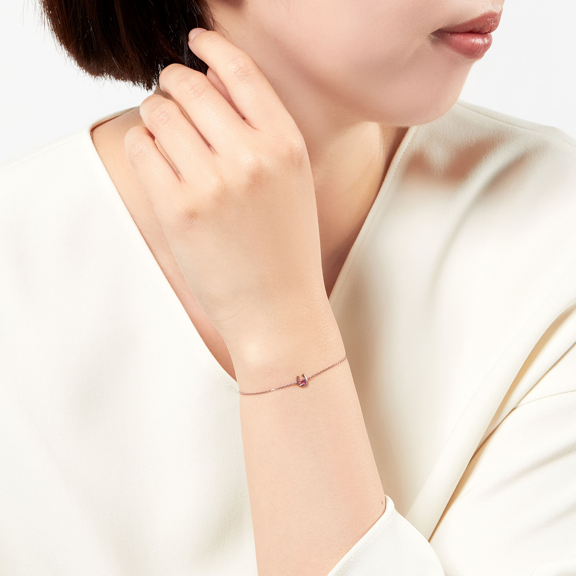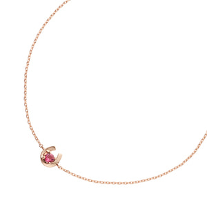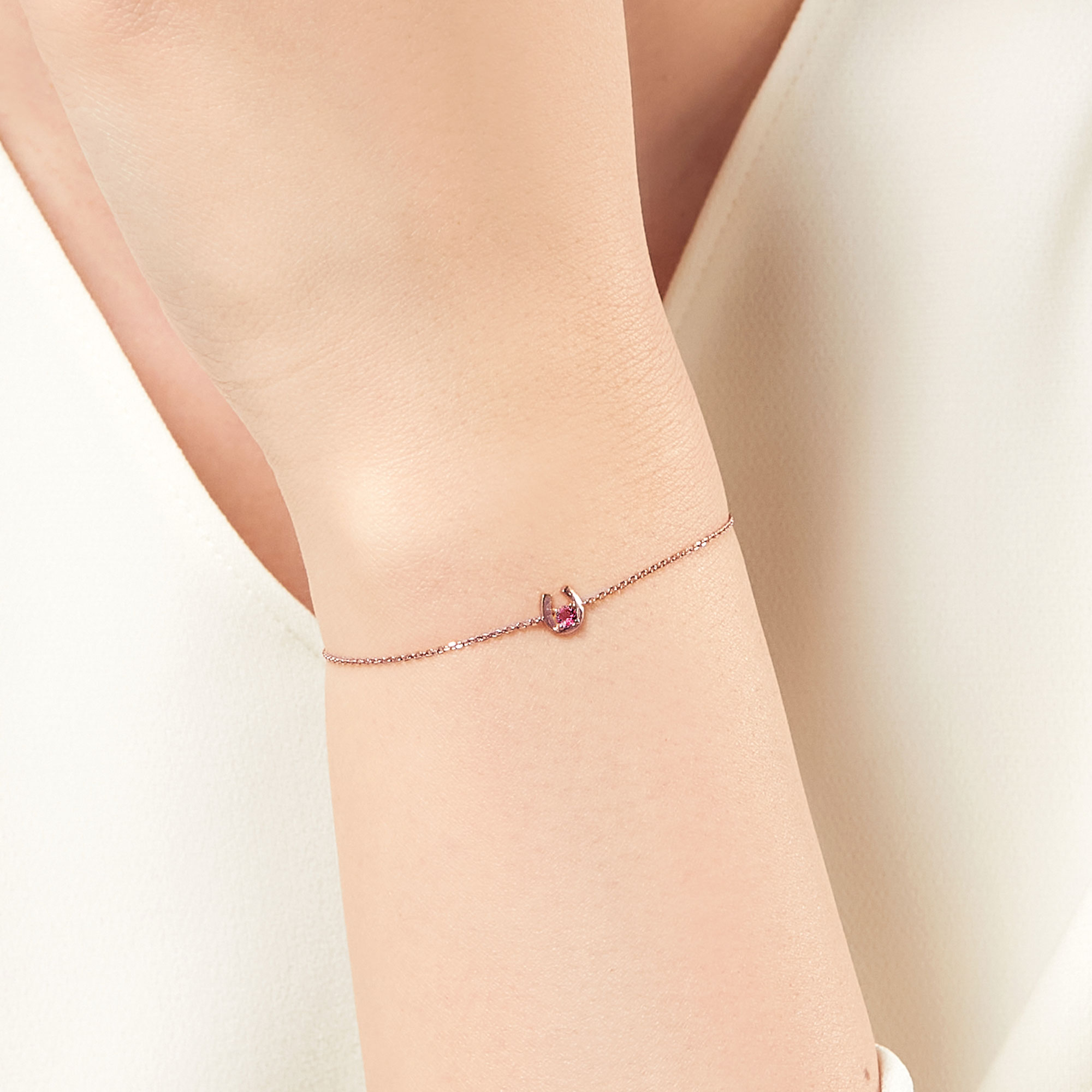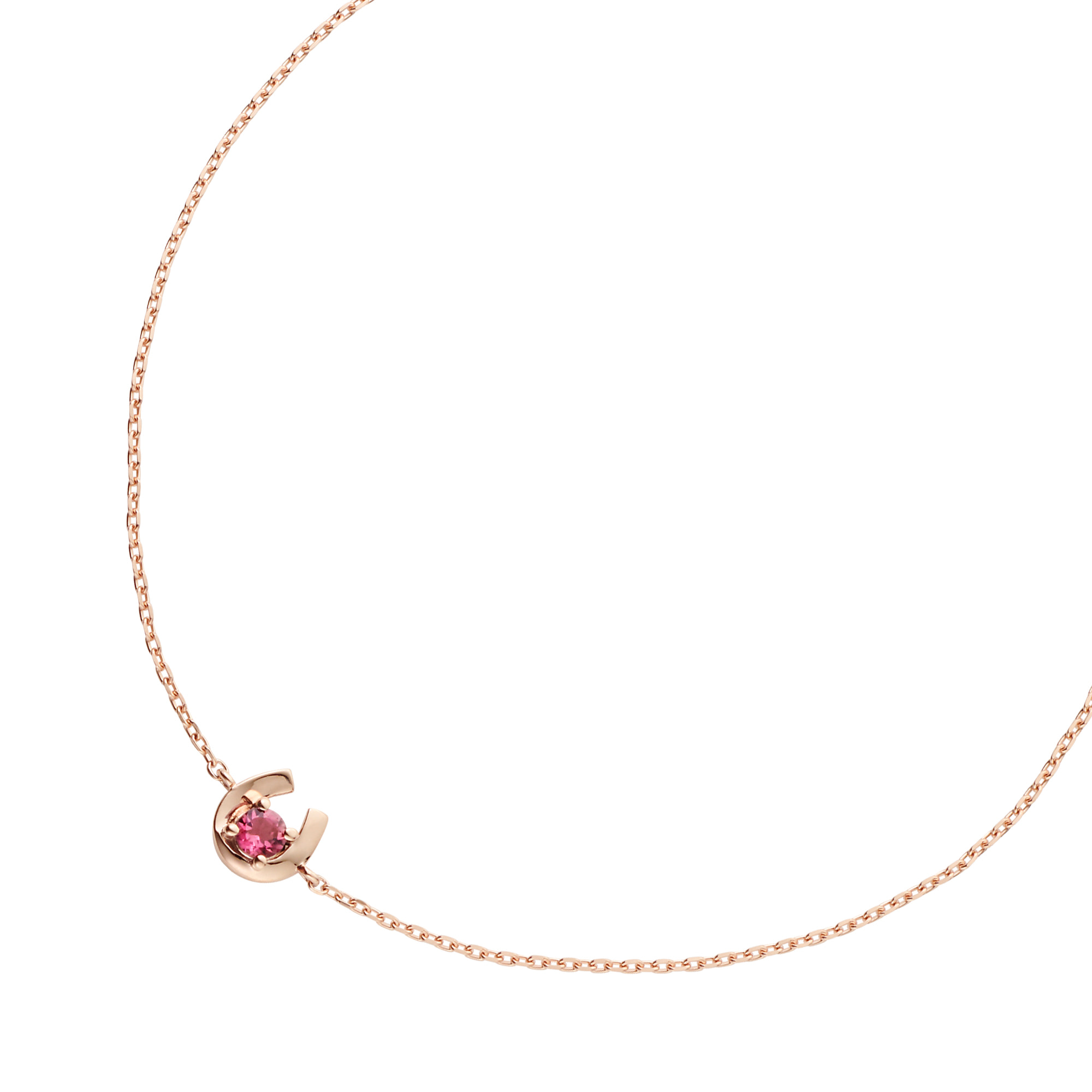 ピンクゴールドで軽やかに描かれた馬蹄の中心には、1石のピンクトルマリンが瑞々しく輝きます。