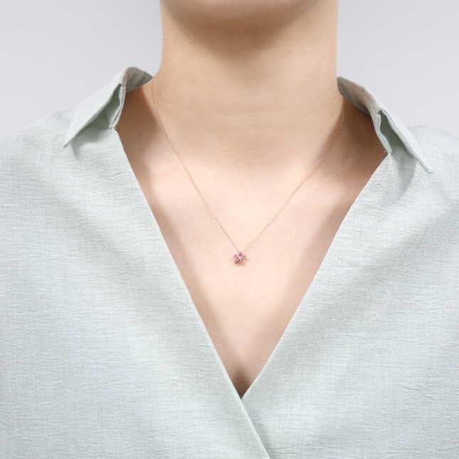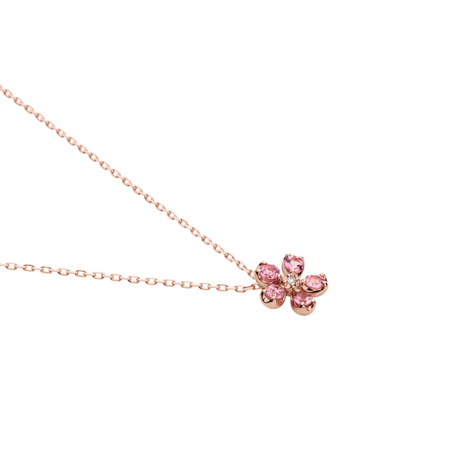 春らしい桜の花を、うるうると瑞々しくきらめくピンクトルマリンでかたどったネックレス。