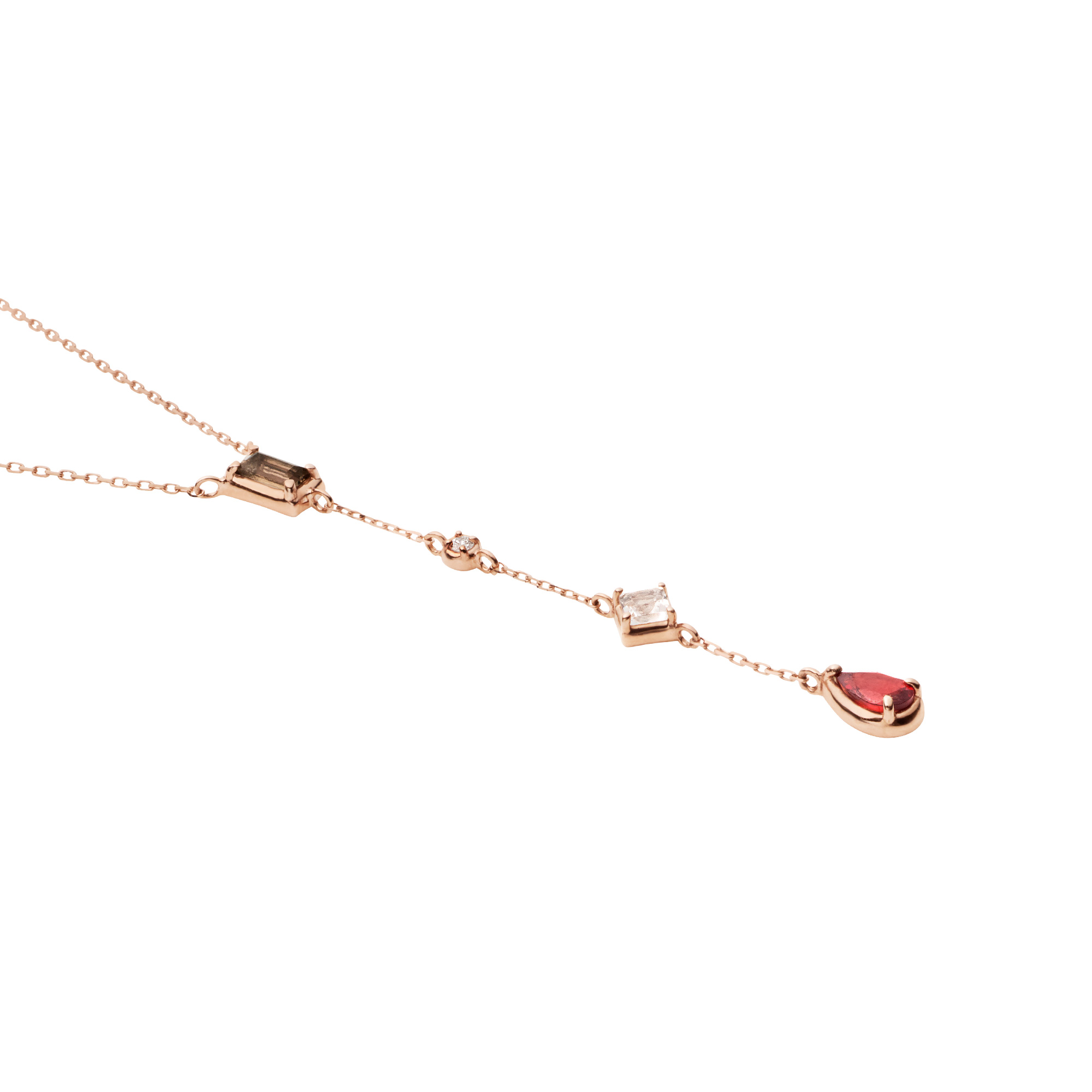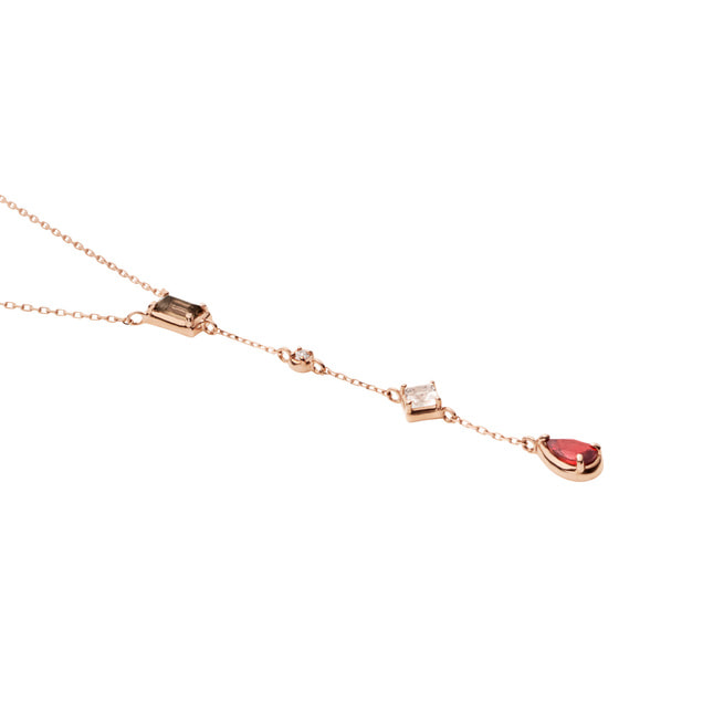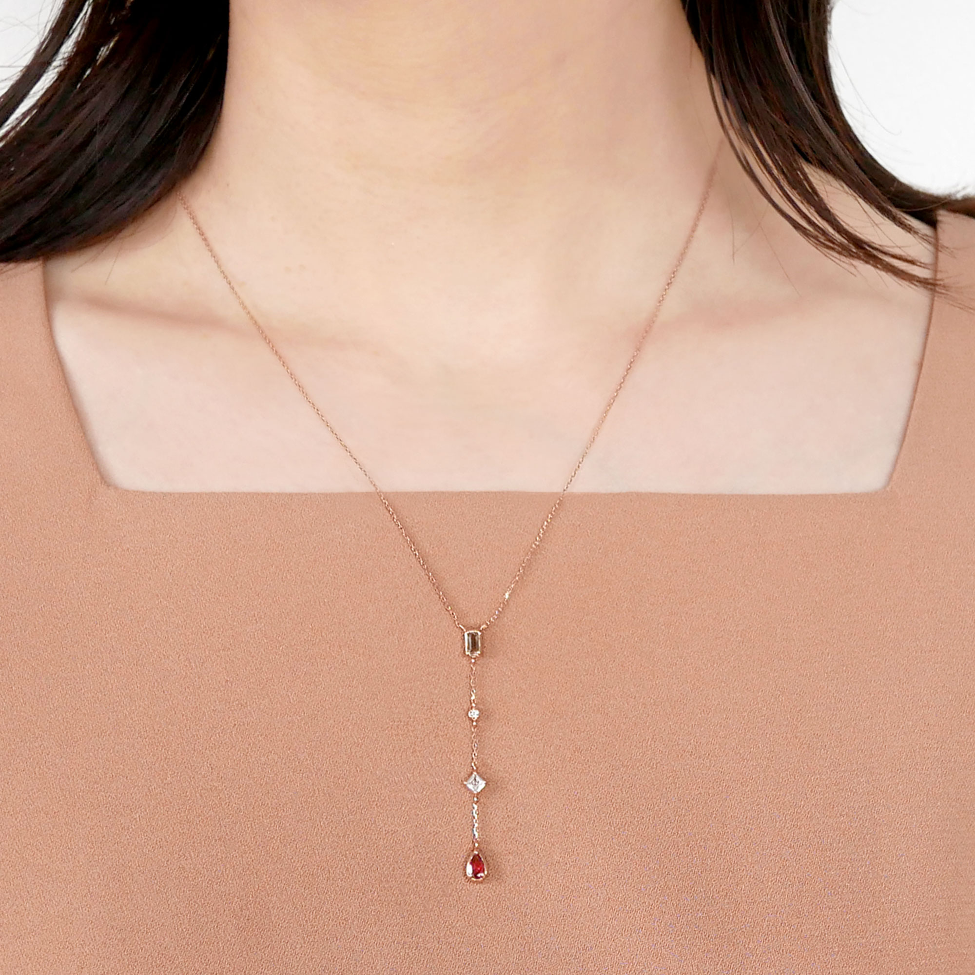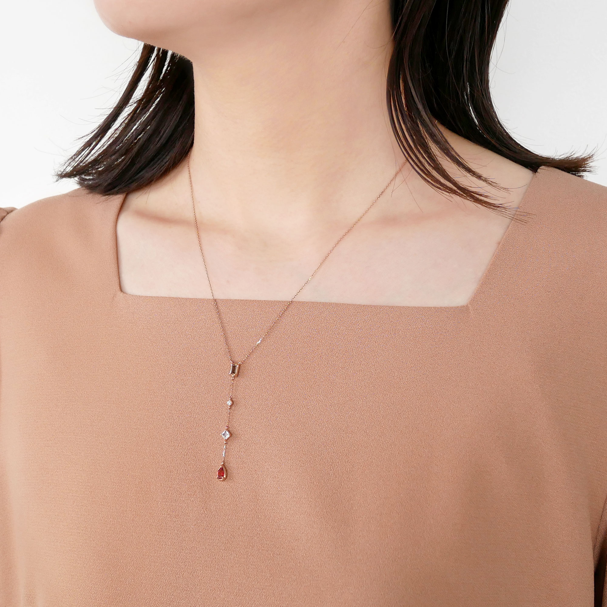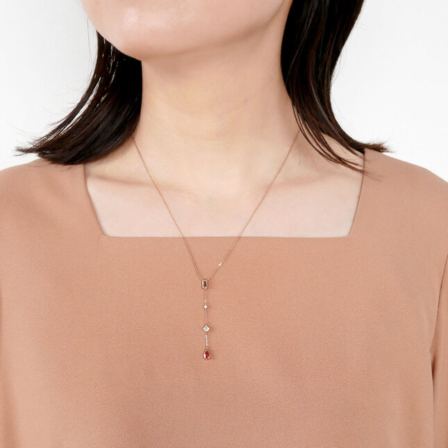 Y字のシルエットが胸元をすっきりと見せ、ガーネットの深い色合いが引き締まった表情をプラスします。