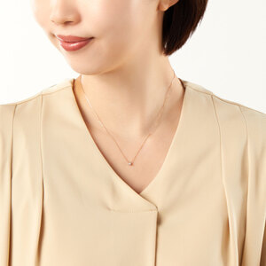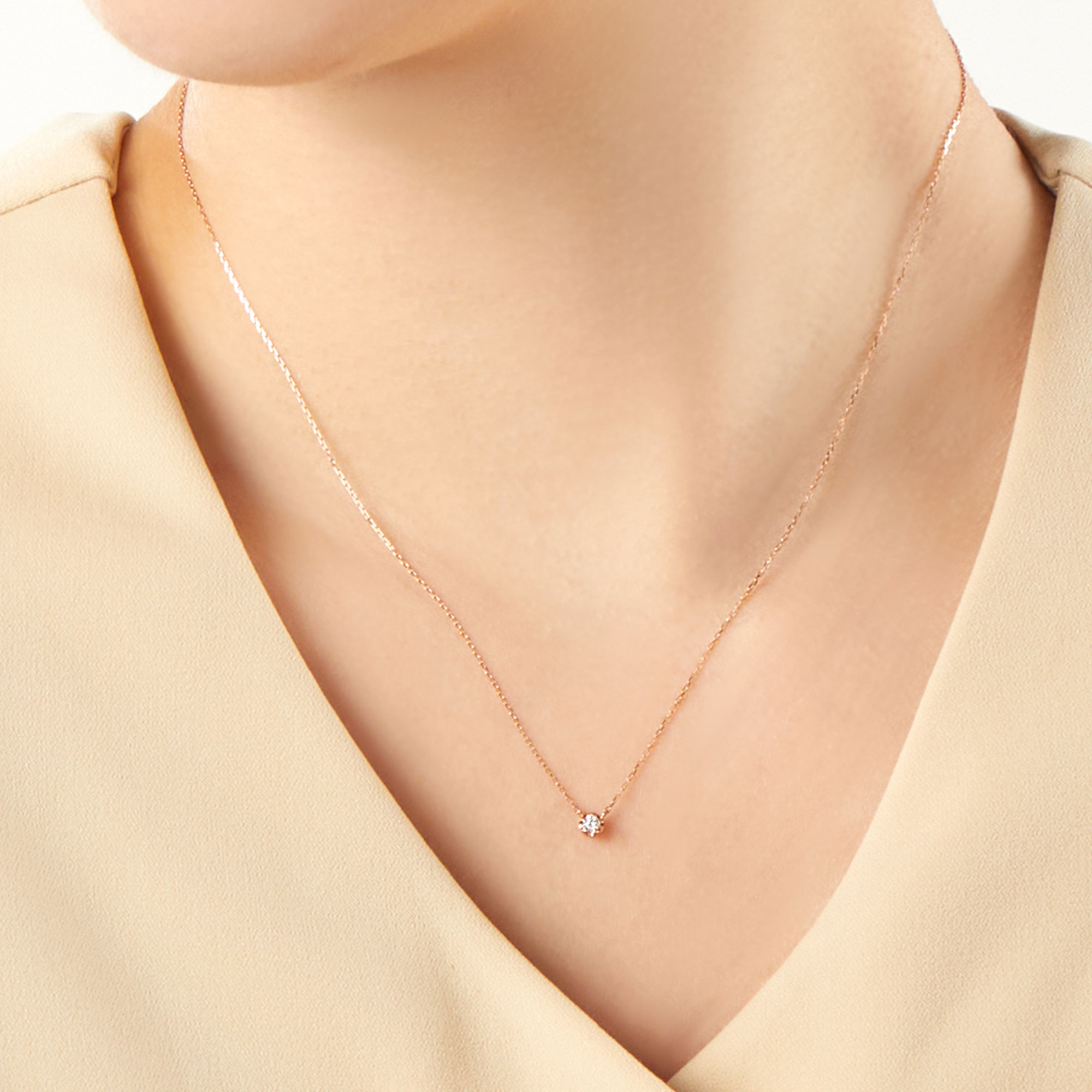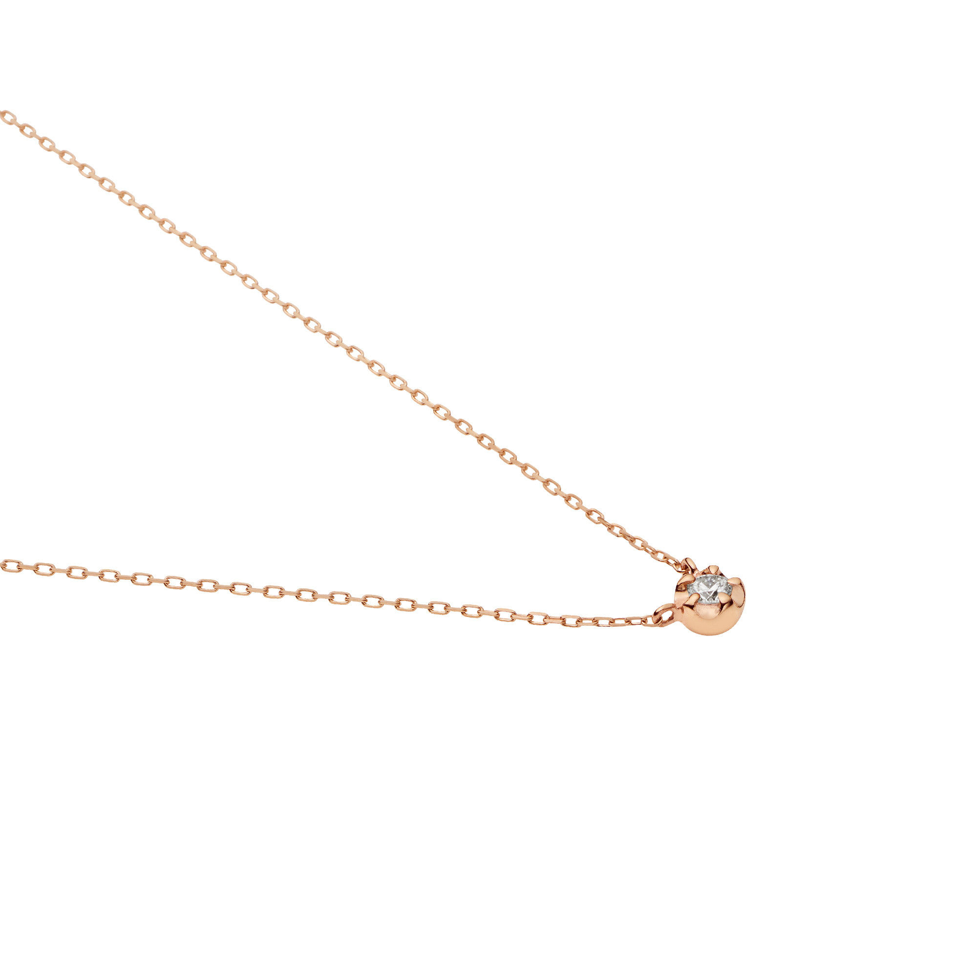 ピンクゴールドの優しげなきらめきで一粒のダイヤモンドを縁取ったネックレス。