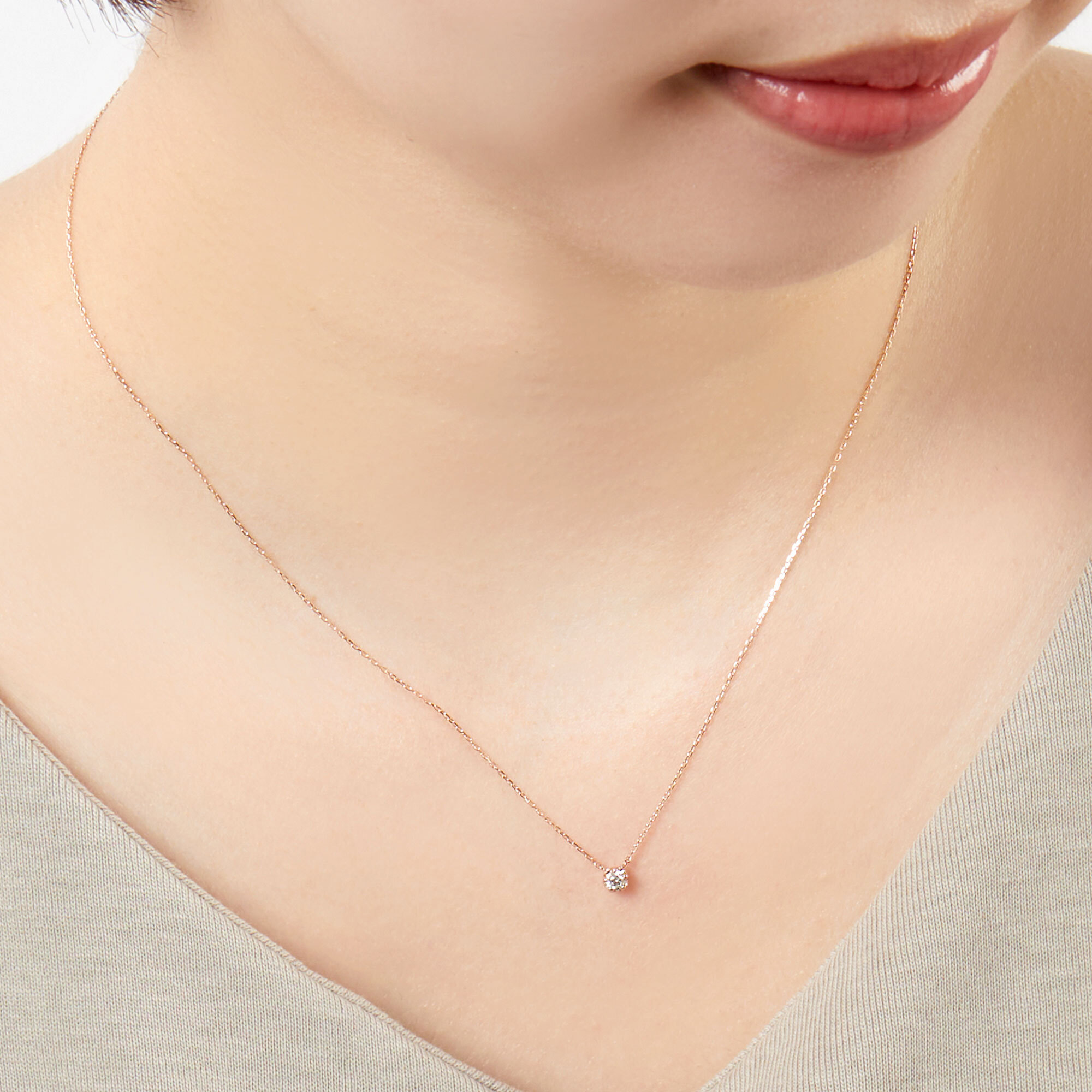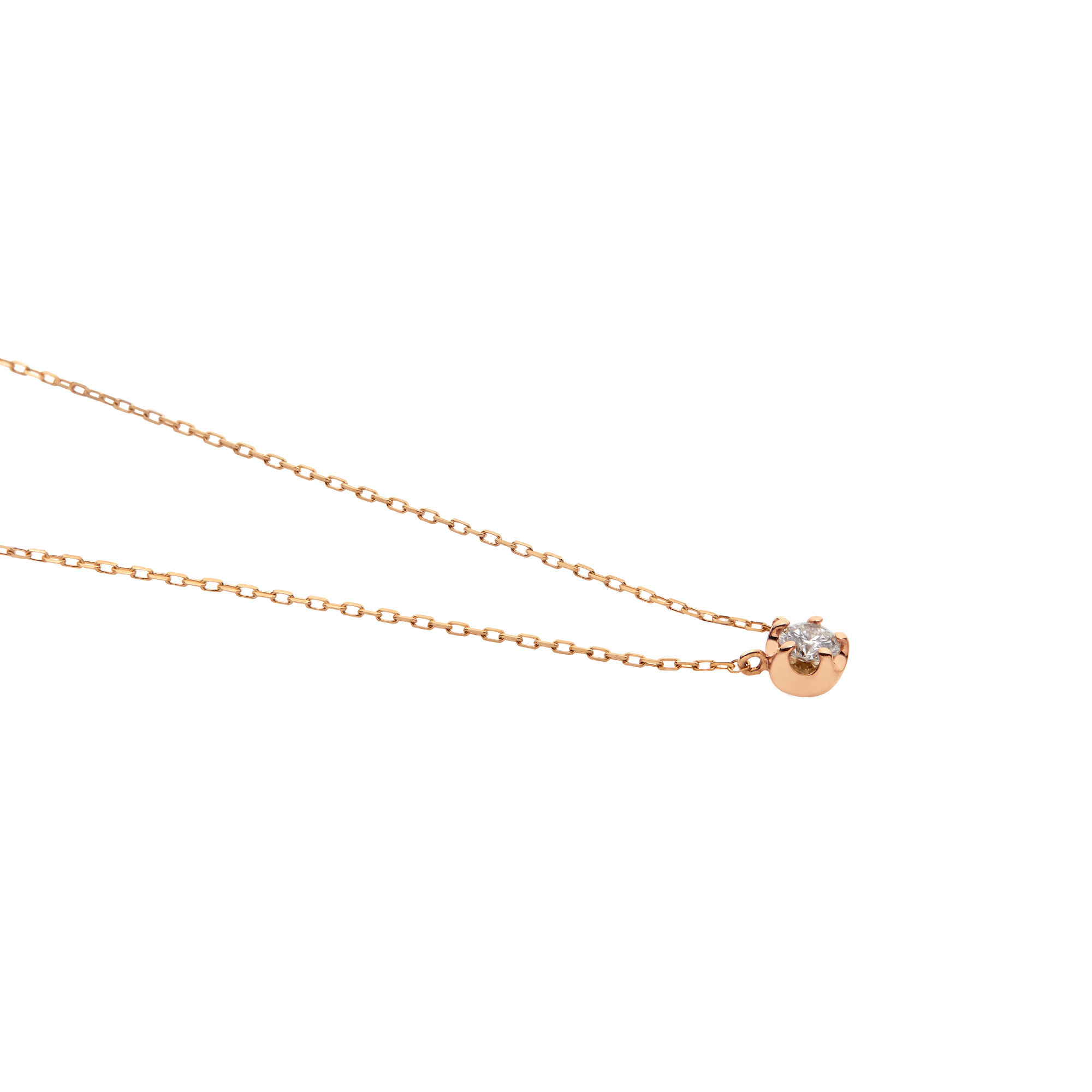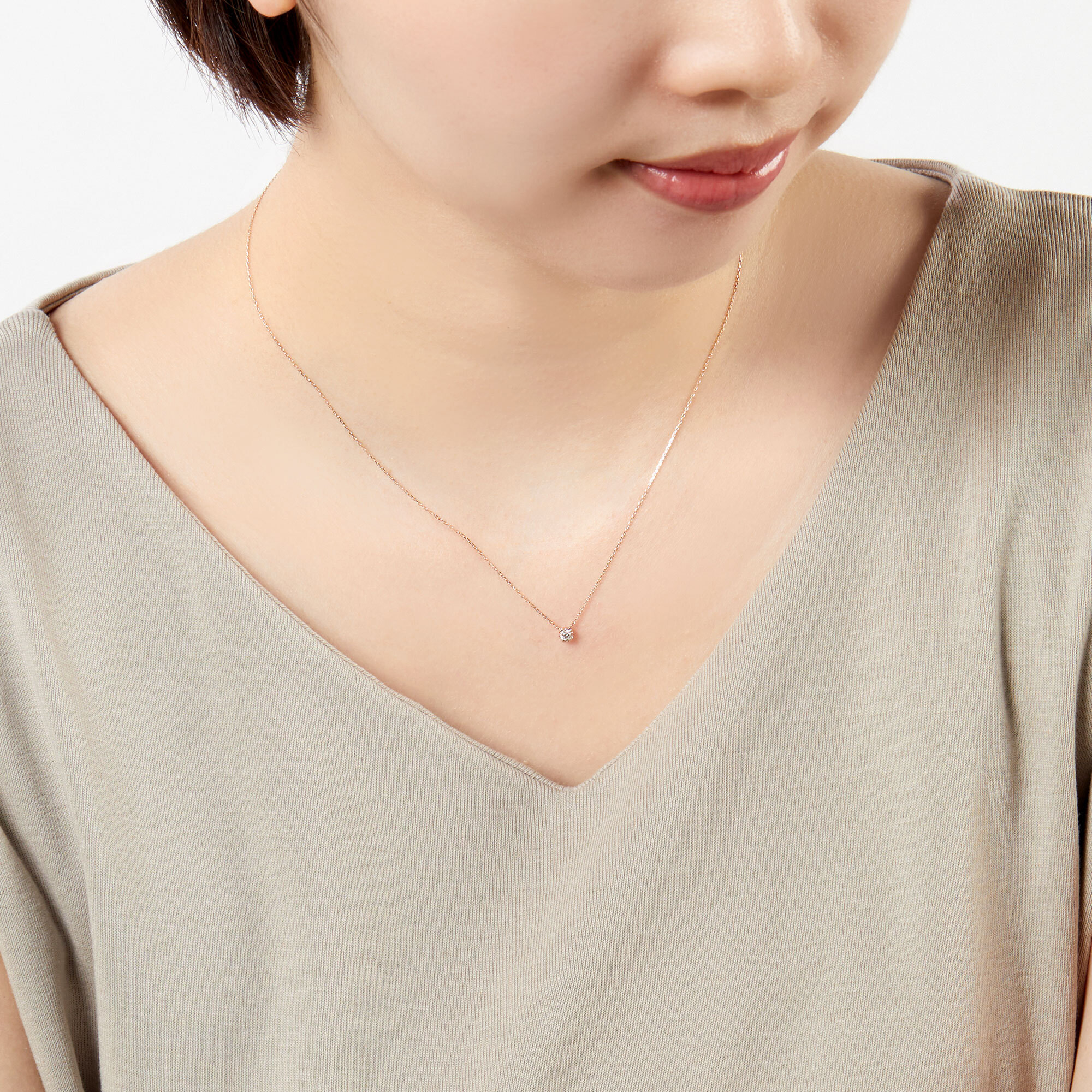 ピンクゴールドのあたたかなきらめきで粒感ある一粒のダイヤモンドを縁取ったネックレス。