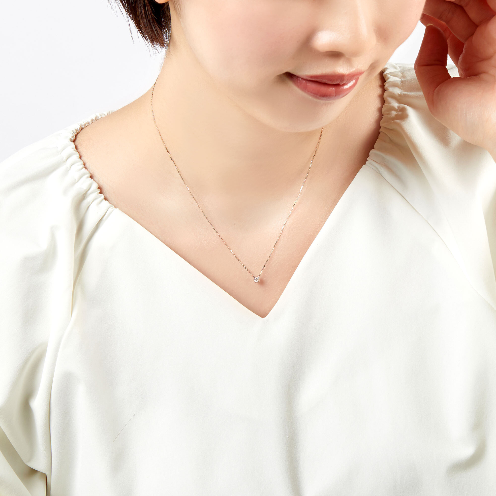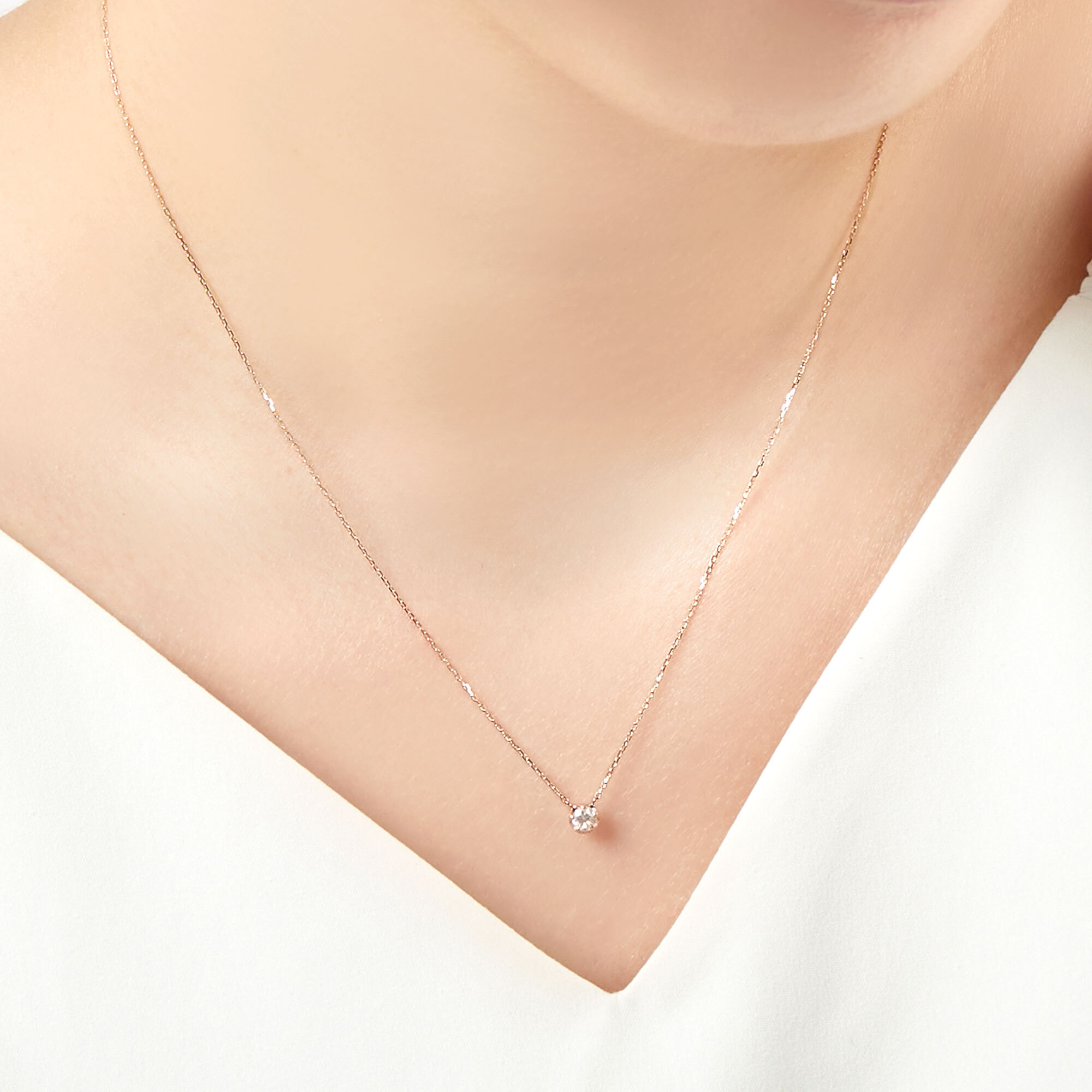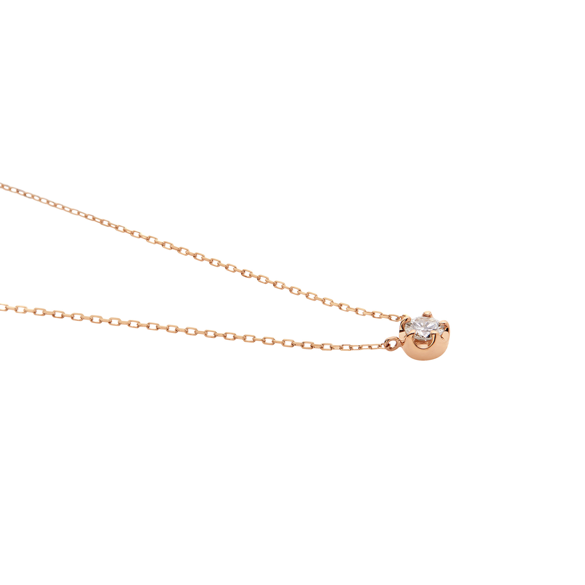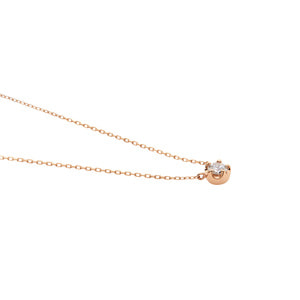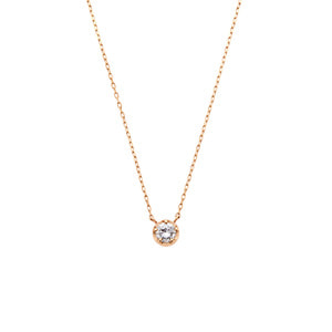 ピンクゴールドのあたたかなきらめきで粒感ある一粒のダイヤモンドを縁取ったネックレス。