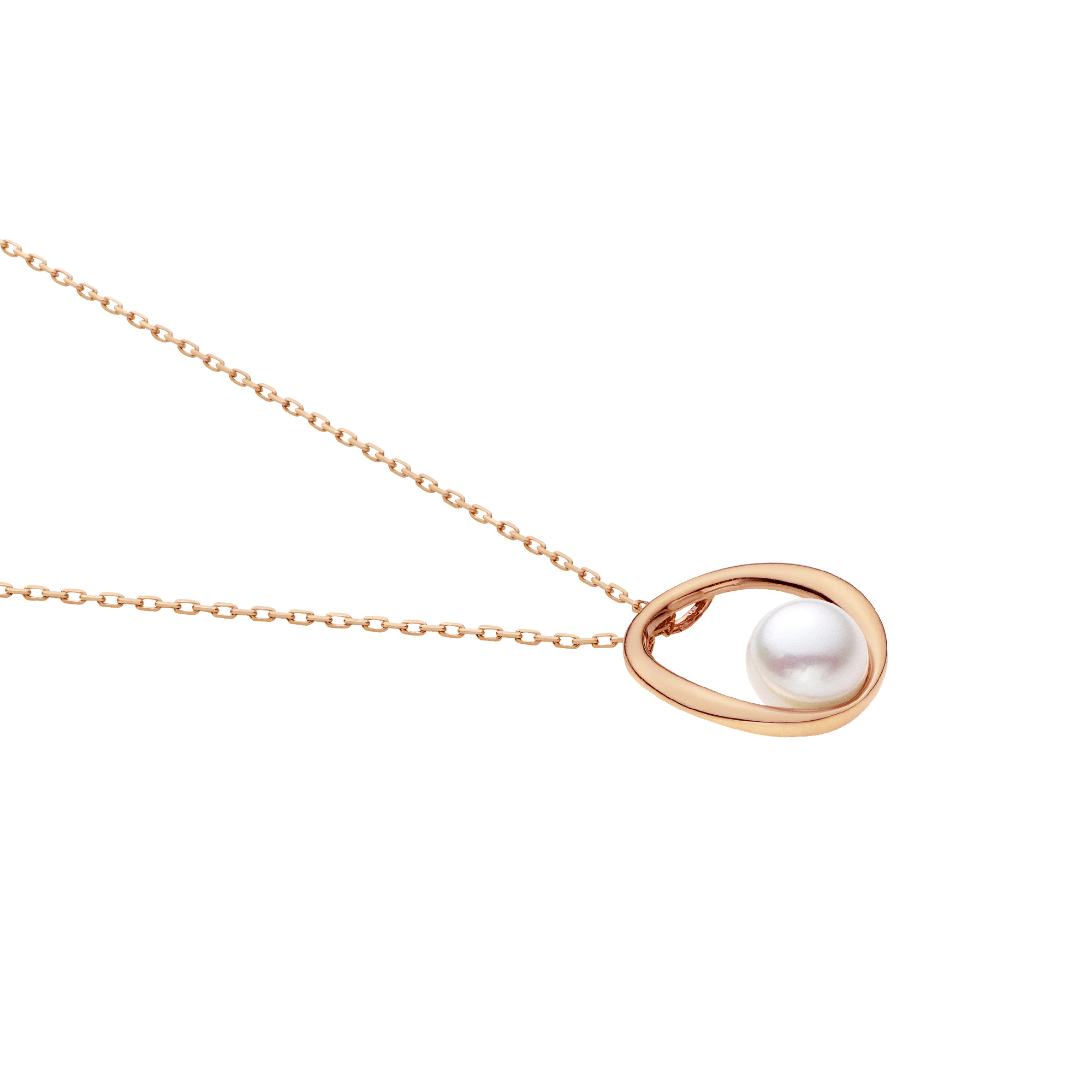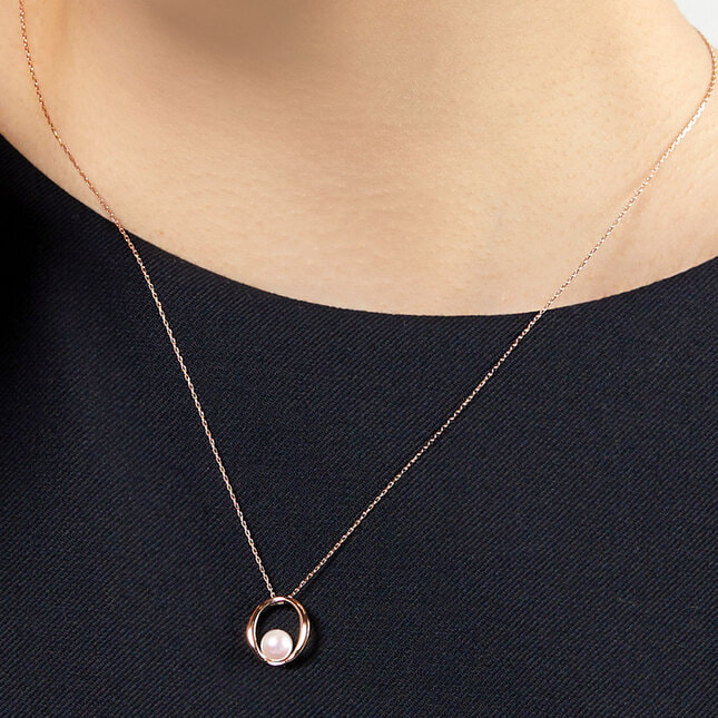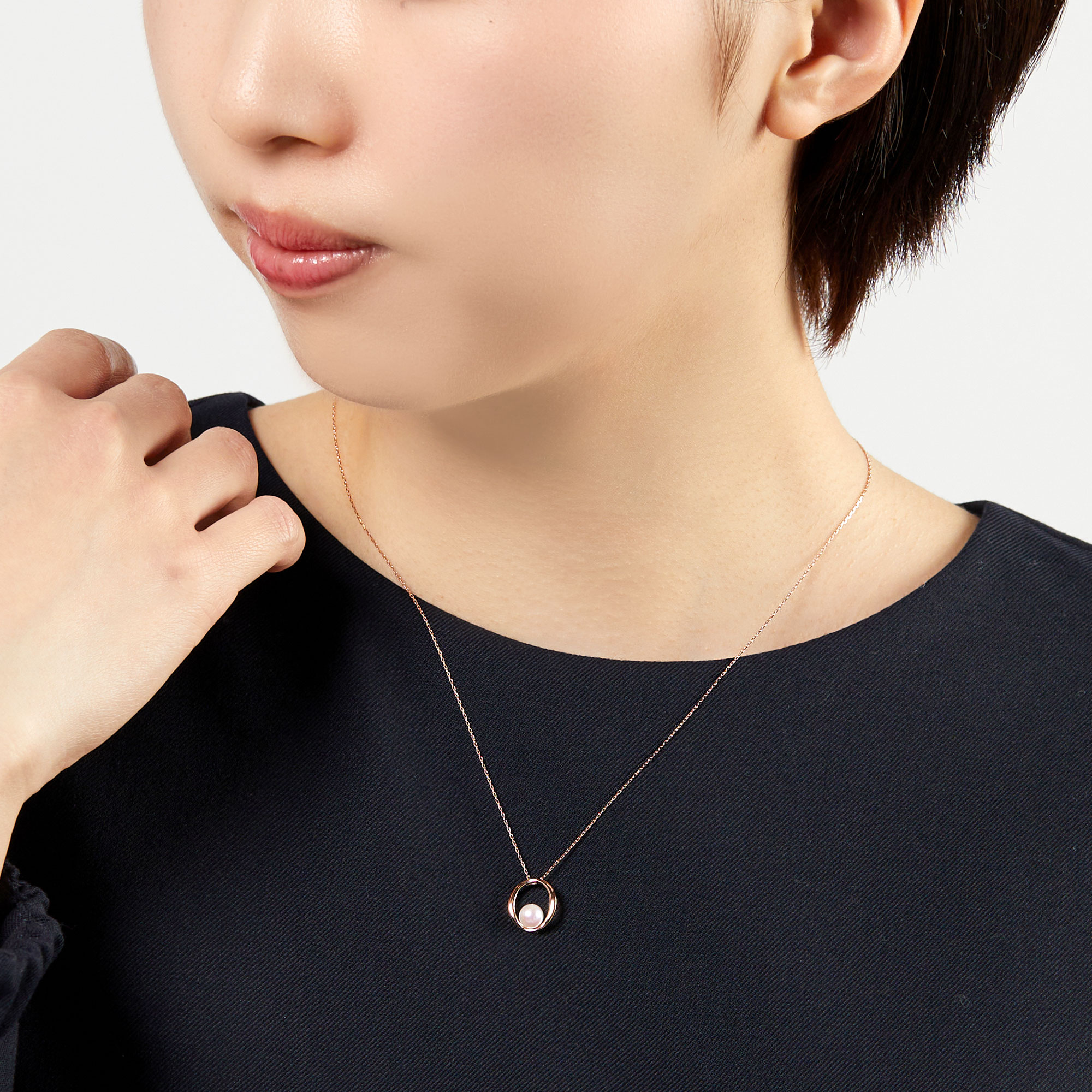 オーバル型のピンクゴールドのフレームに、一粒のアコヤパールをあしらったネックレス。