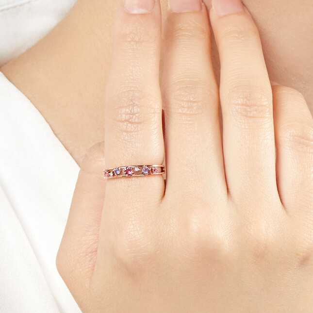 深みのある輝きのピンクトルマリンに明るいライトアメシストを合わせた、大人っぽいカラーリングのリング。