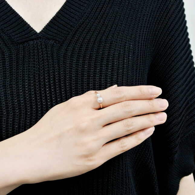 大小のパールとフラットなゴールドというコントラストを効かせた取り合わせは、アンバランスな印象から生まれる可愛らしさが魅力です。