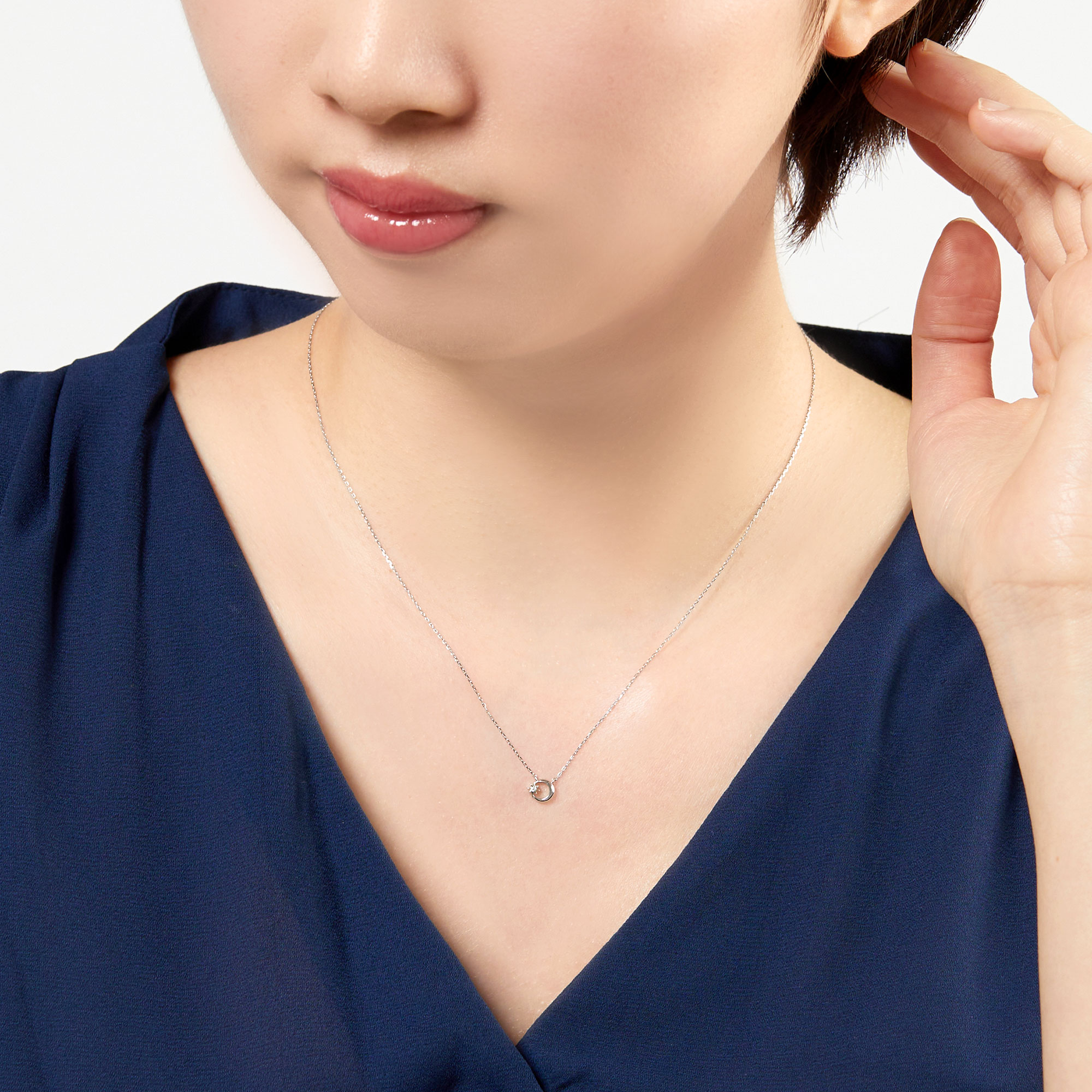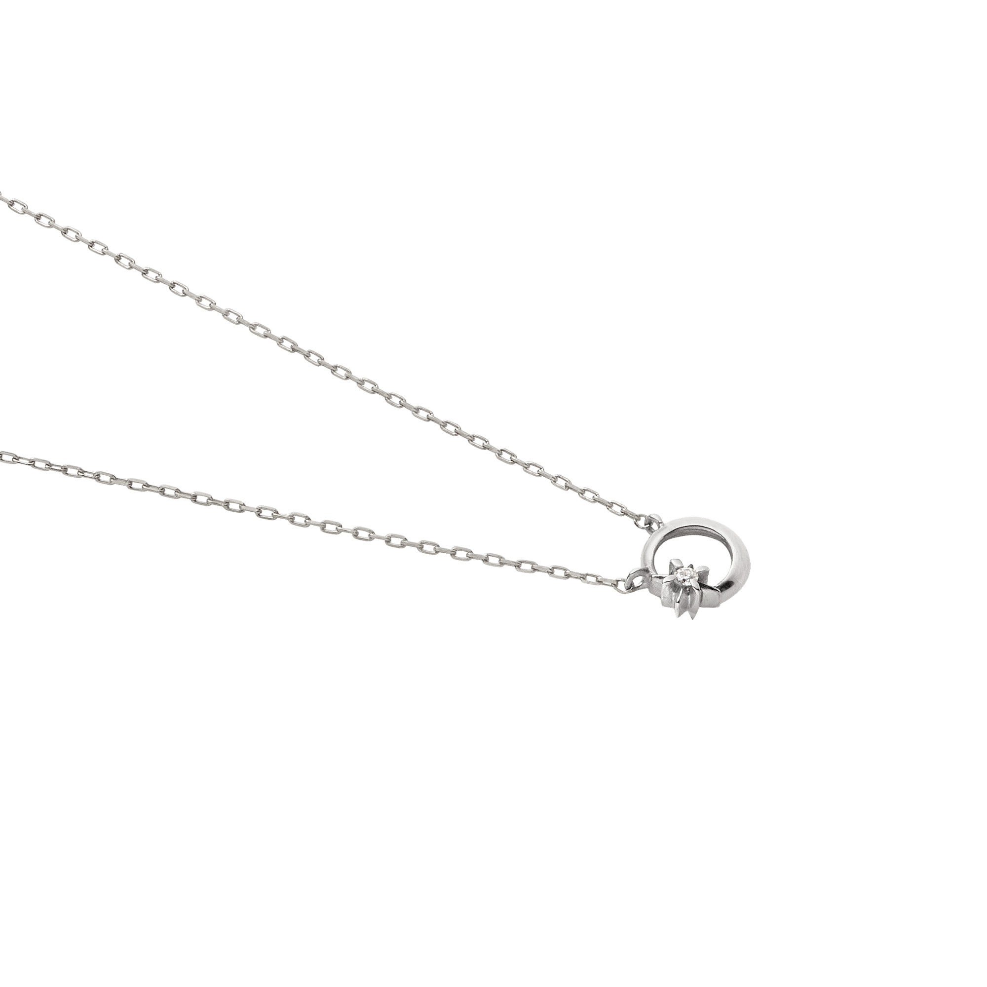 ホワイトゴールドの質感が際立つつややかな三日月モチーフのネックレス。
