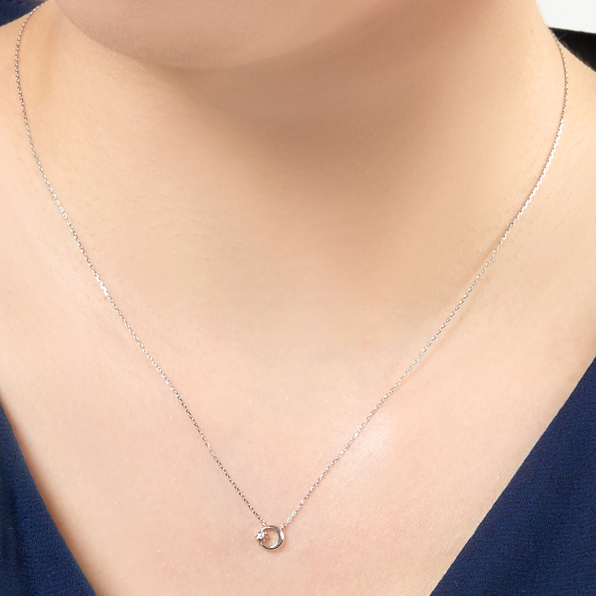 三日月によりそうように輝く星モチーフには1石のダイヤモンドがあしらわれ、控えめながら女性らしいきらめきを感じさせるデザインです。
