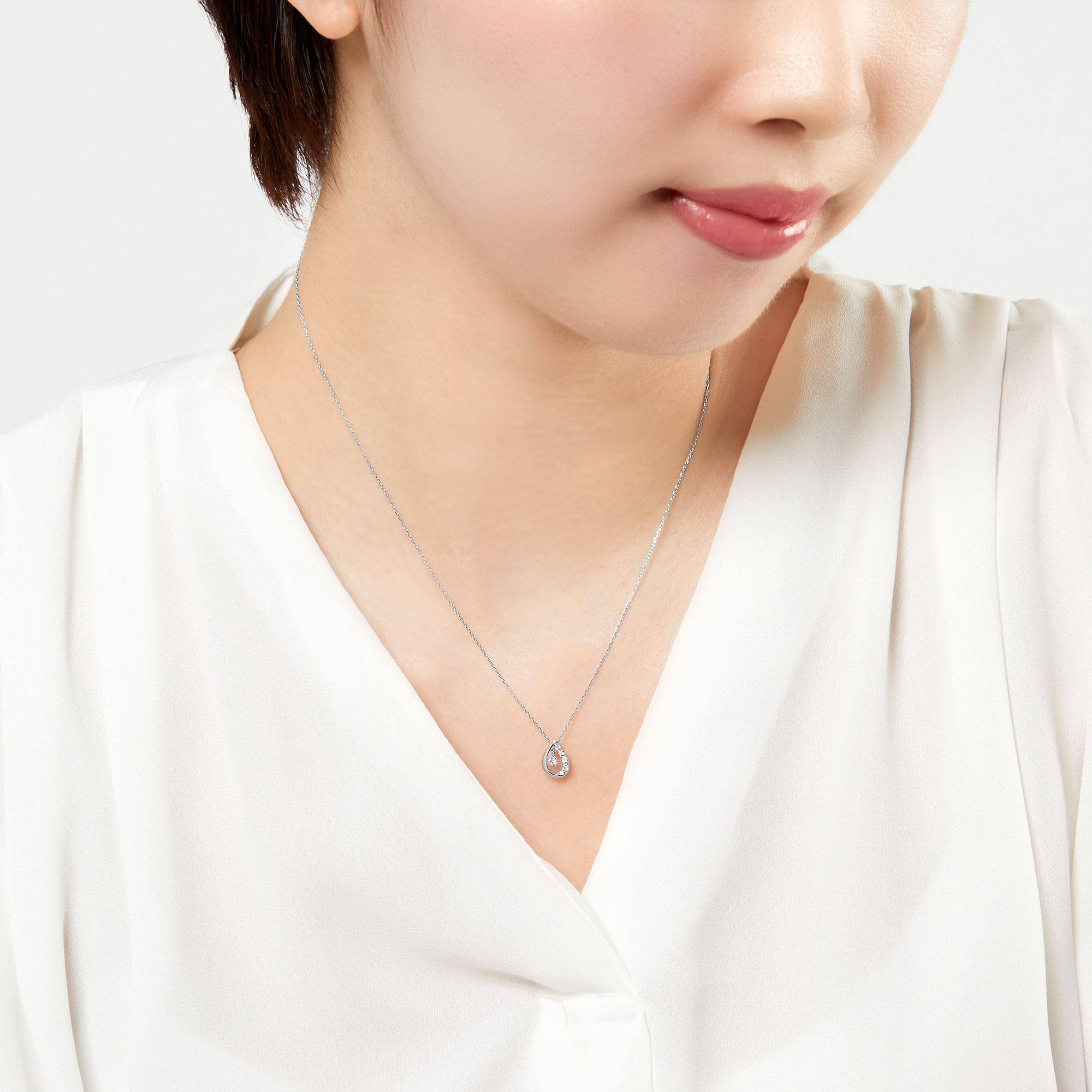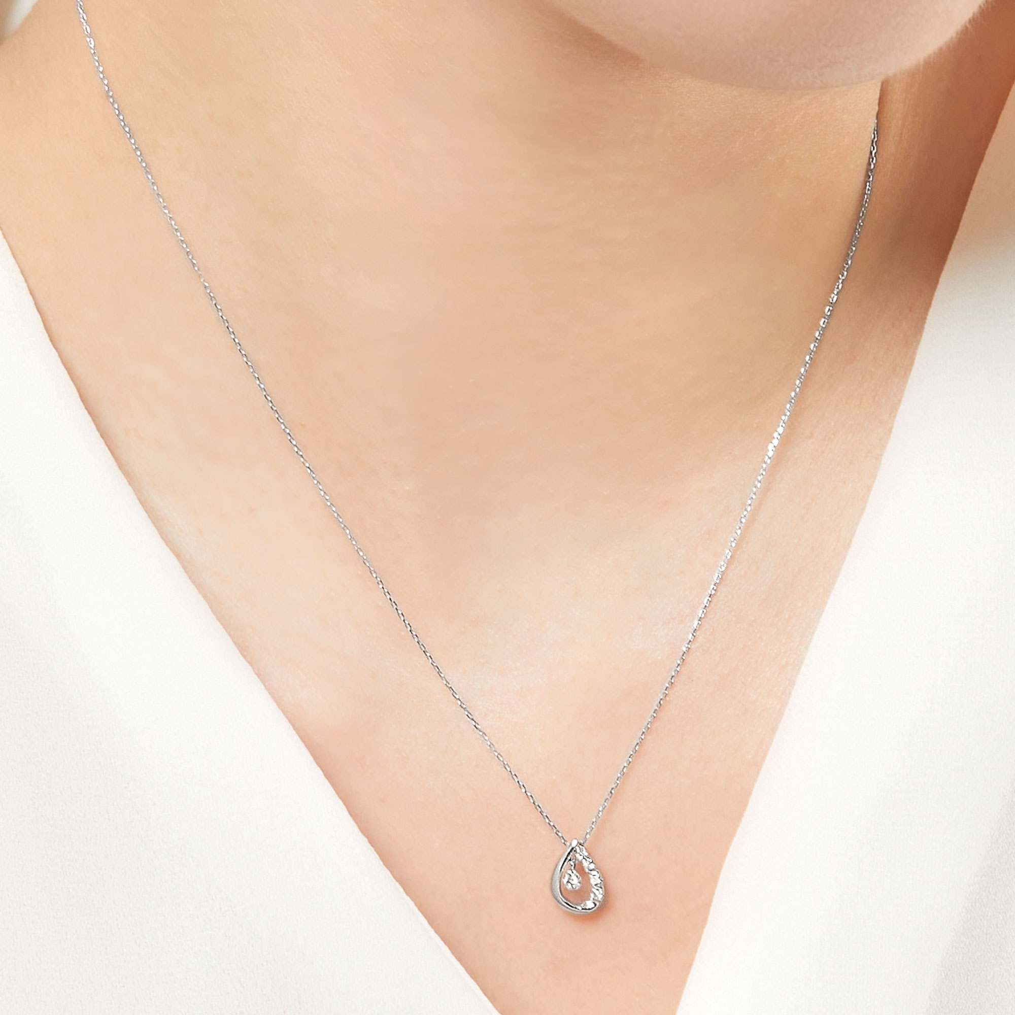 ふっくらとしたしずくの中でダイヤモンドが軽やかに揺れるネックレス。