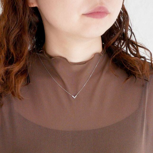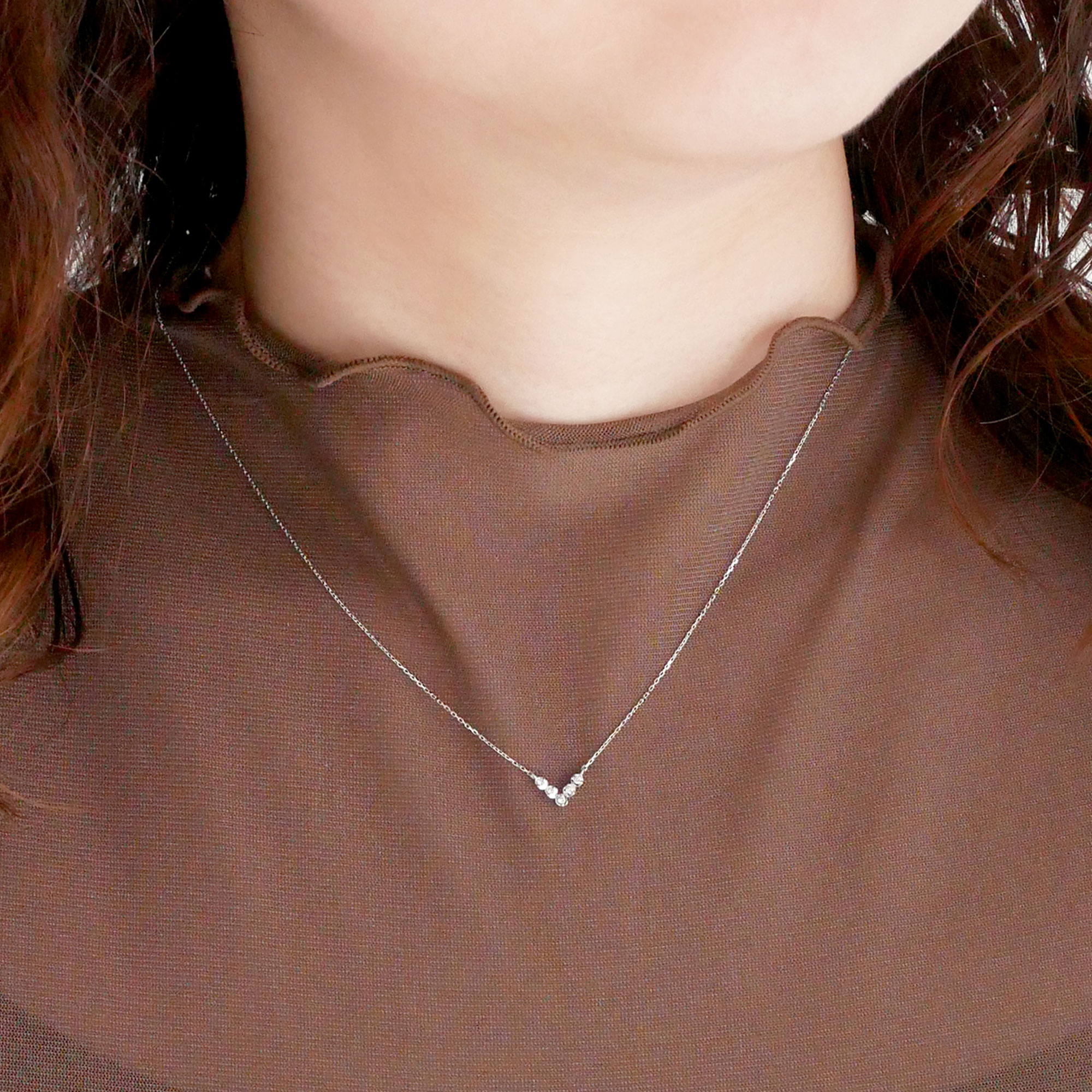 Vのフォルムに5石のダイヤモンドが繊細にきらめくネックレス。