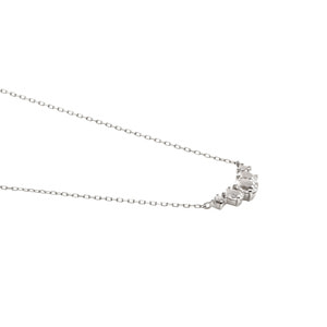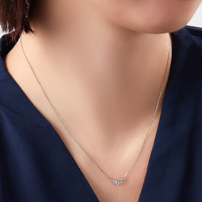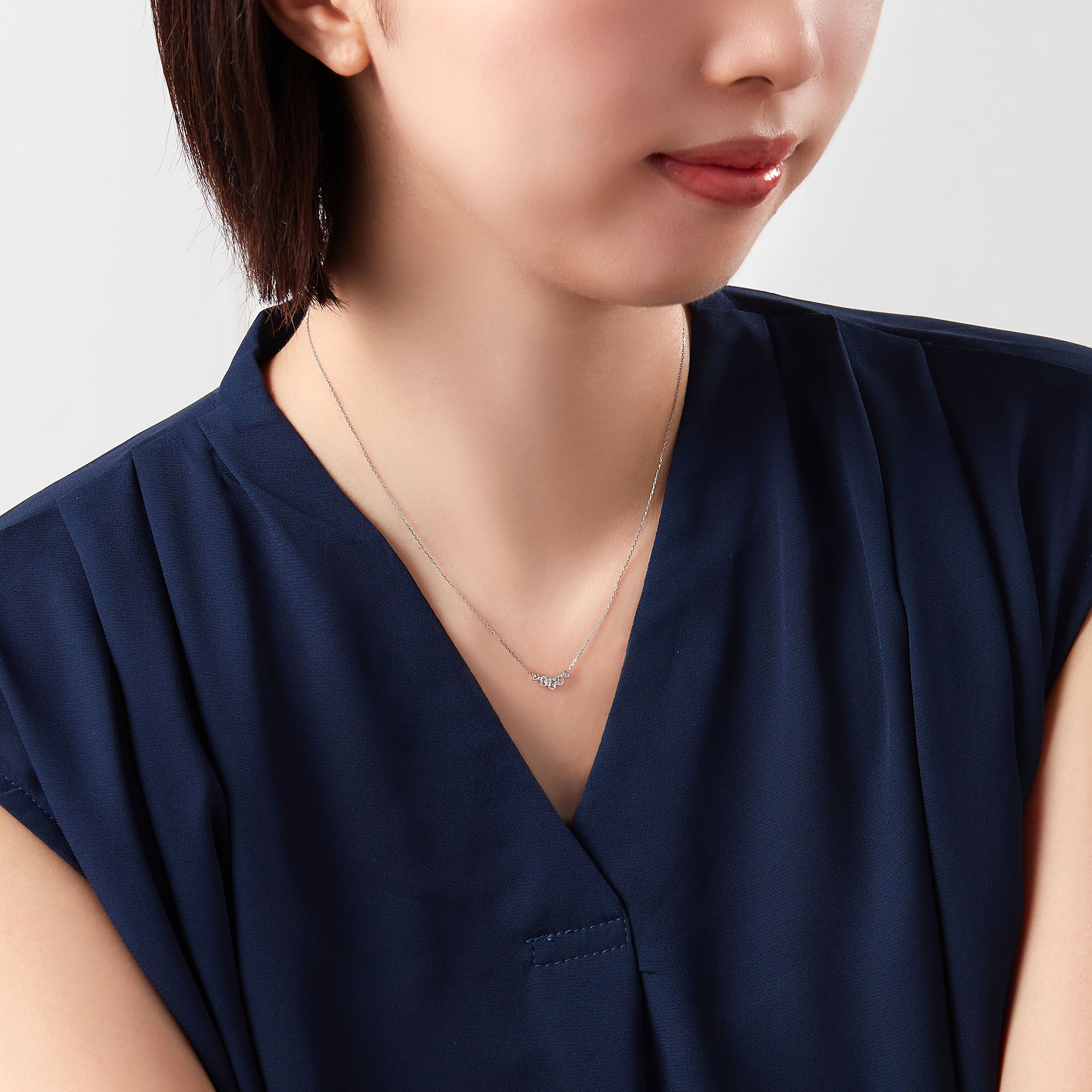 オーバルカットを横に並べたデザインが、少しクラシカルな雰囲気をまとわせながら胸元に上品な印象をプラス。
