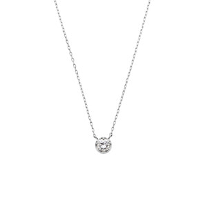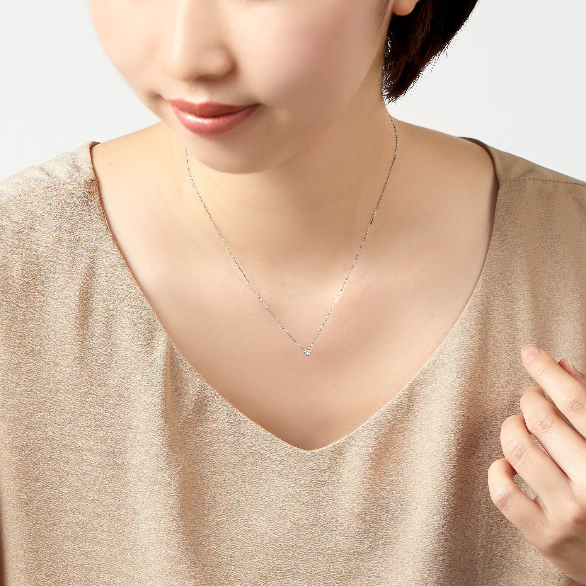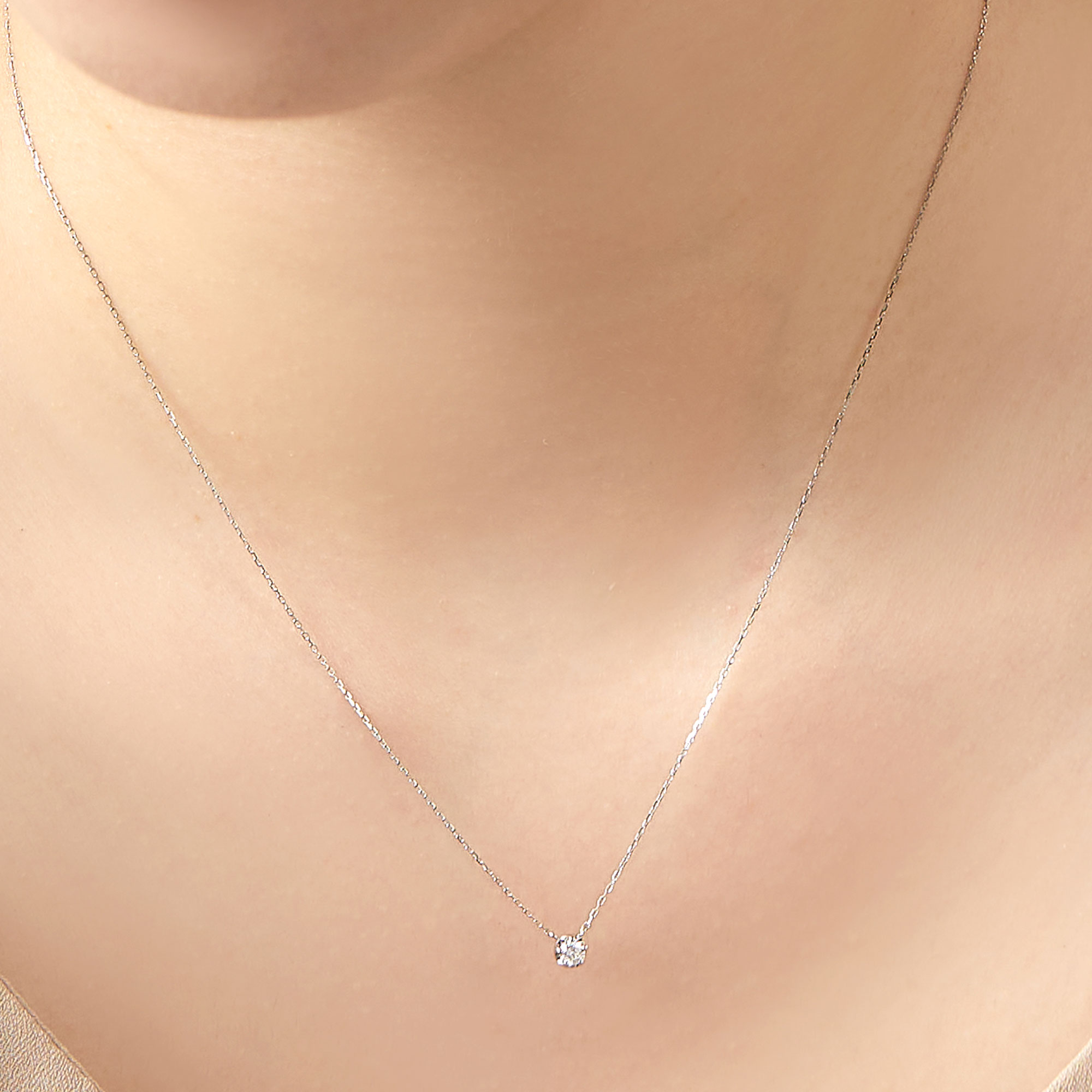 ホワイトゴールドのクールなきらめきで粒感ある一粒のダイヤモンドを縁取ったネックレス。