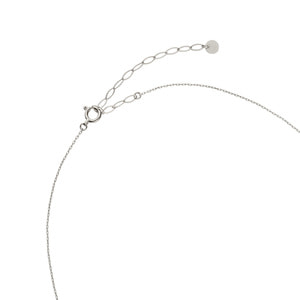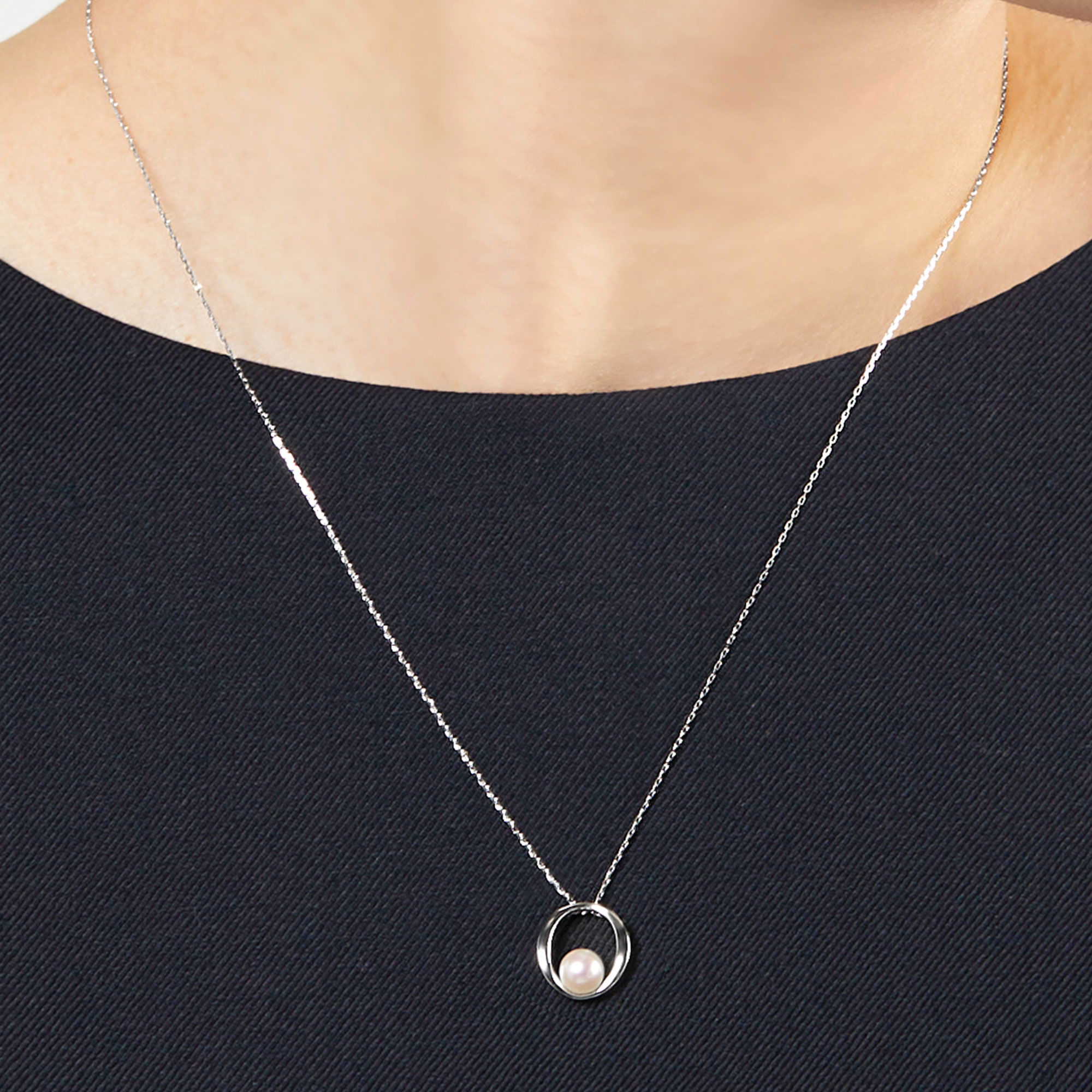 オーバル型のホワイトゴールドのフレームに、一粒のアコヤパールをあしらったネックレス。