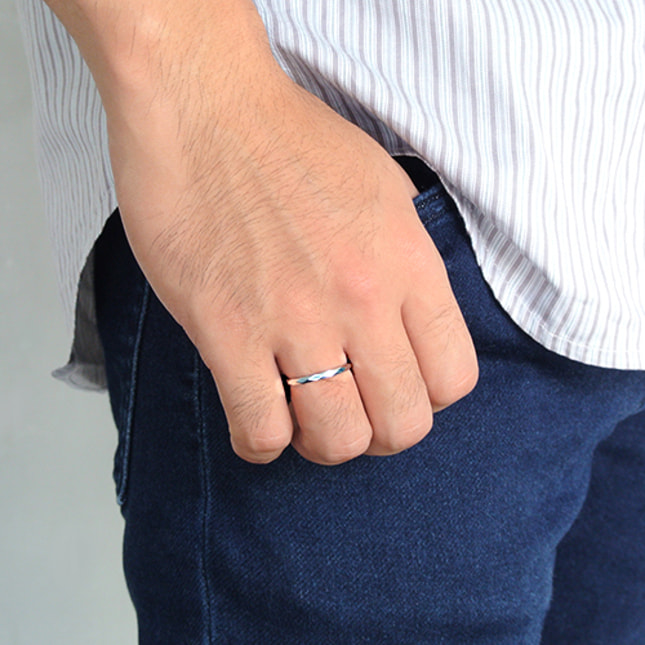 ストレートなアームにダイヤ形のカットを施した地金リング。