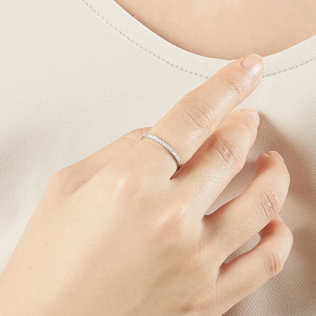 途切れることのない輝きとシンプルなデザインが魅力的な、ダイヤモンドハーフエタニティリング。