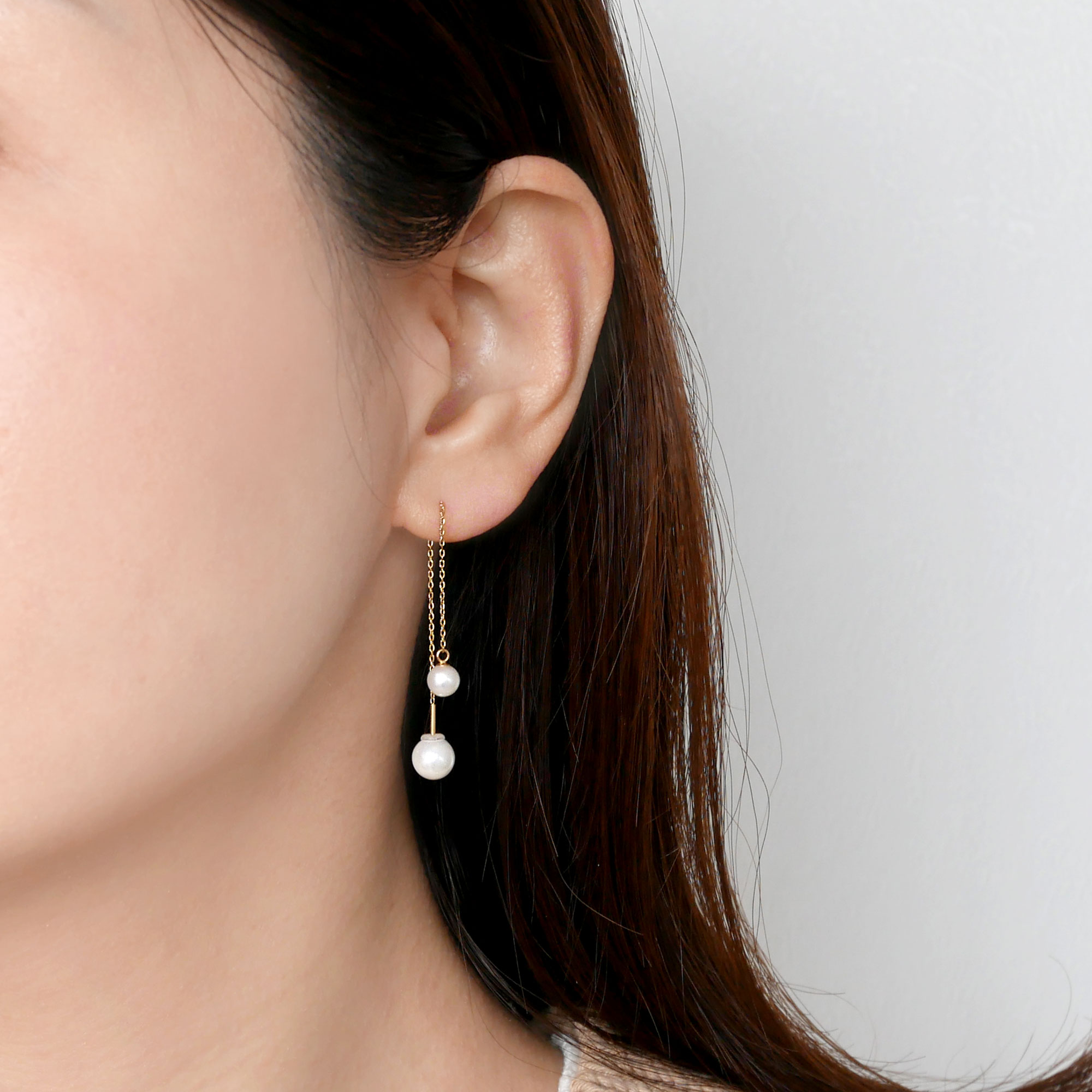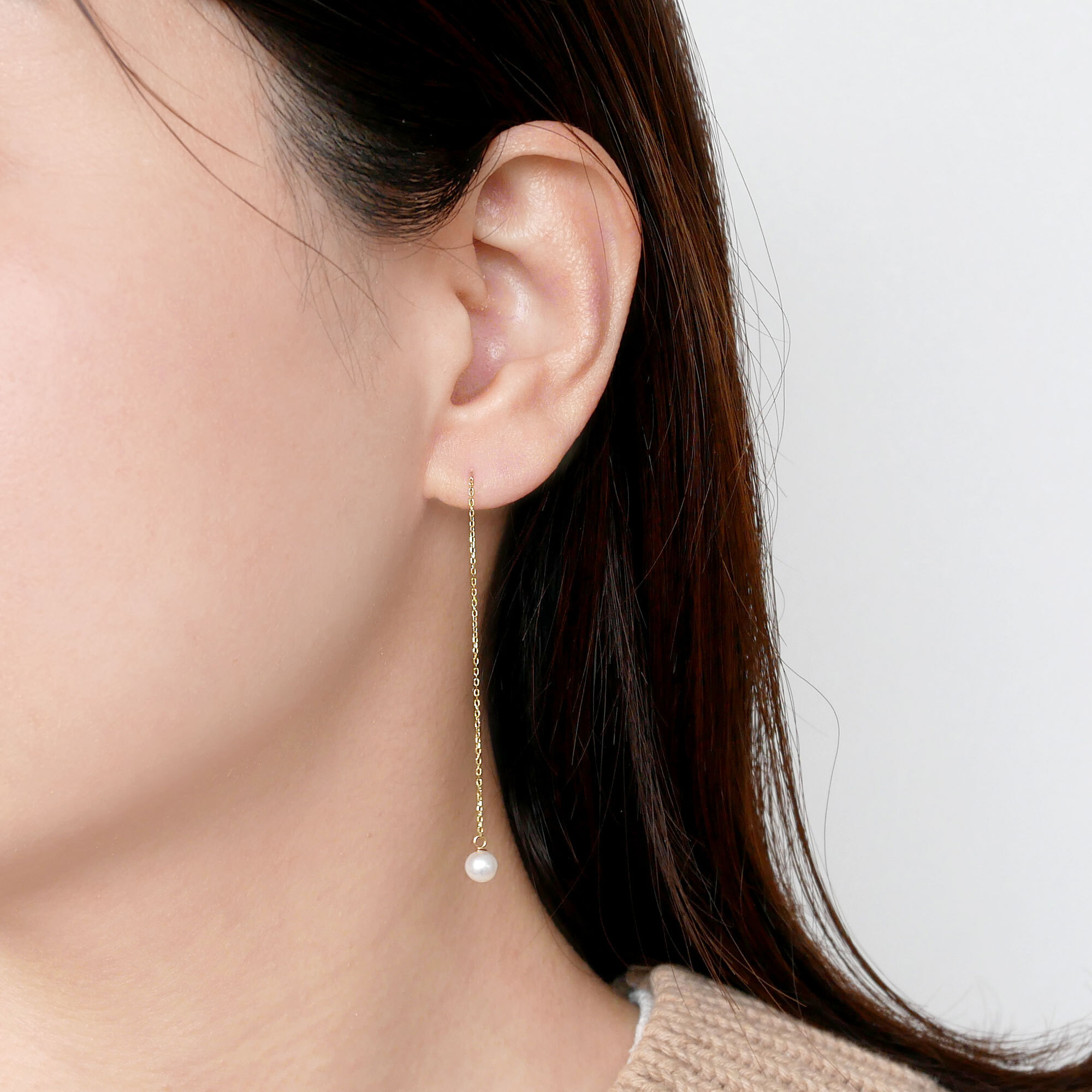 チェーンをピアスホールに通してパールキャッチを着けると、パールが前後で揺れるデザインに。