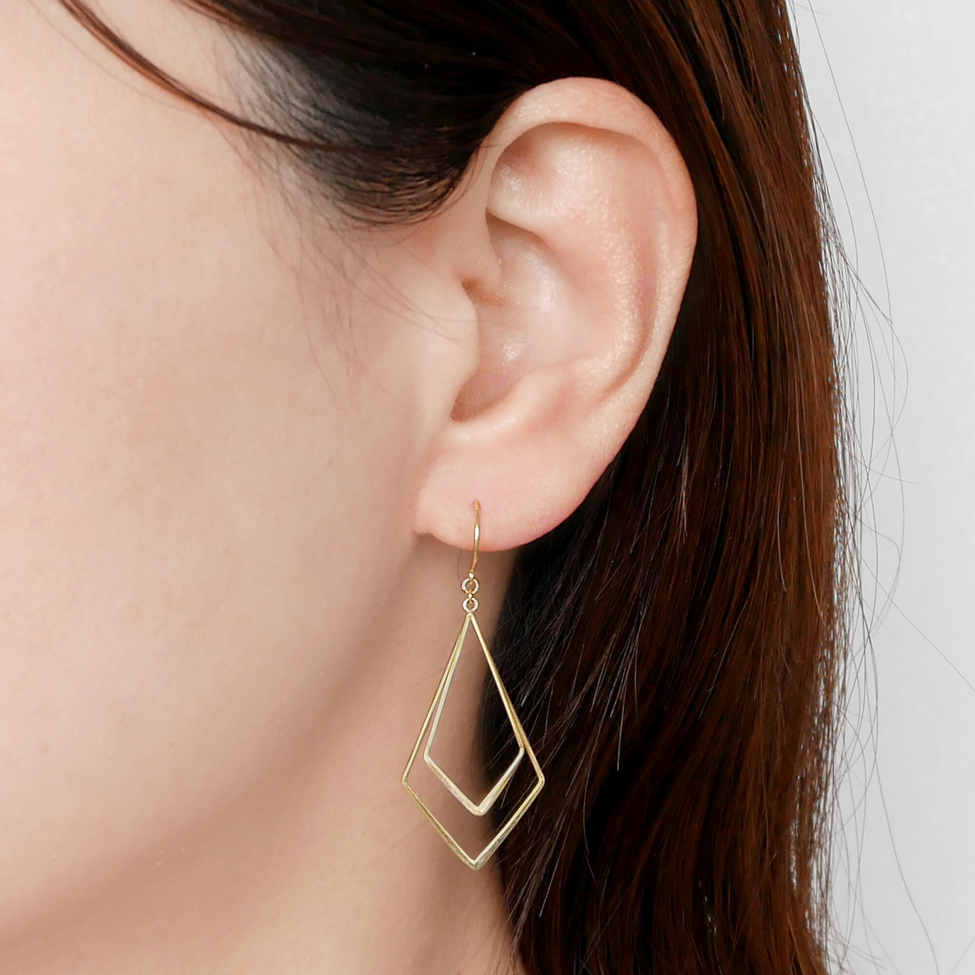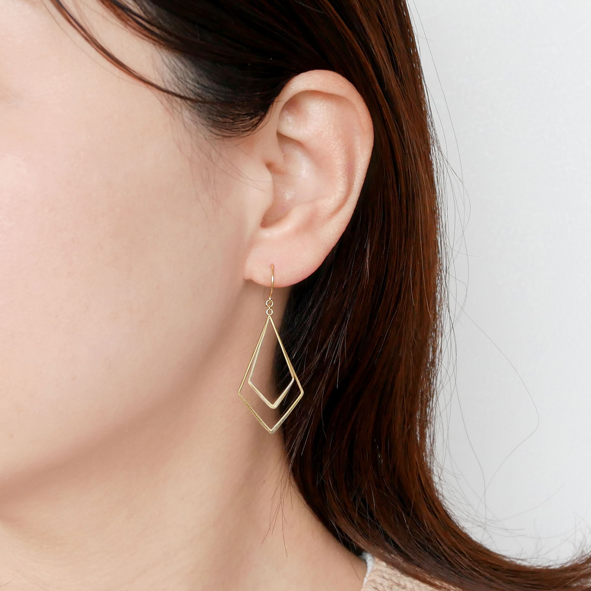 イエローゴールドの光沢と重なりあうひし形のモチーフで存在感のあるピアス。