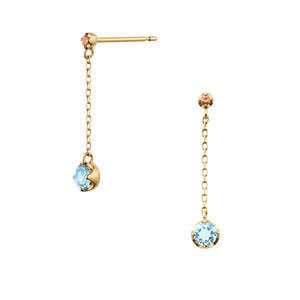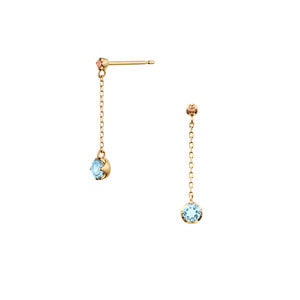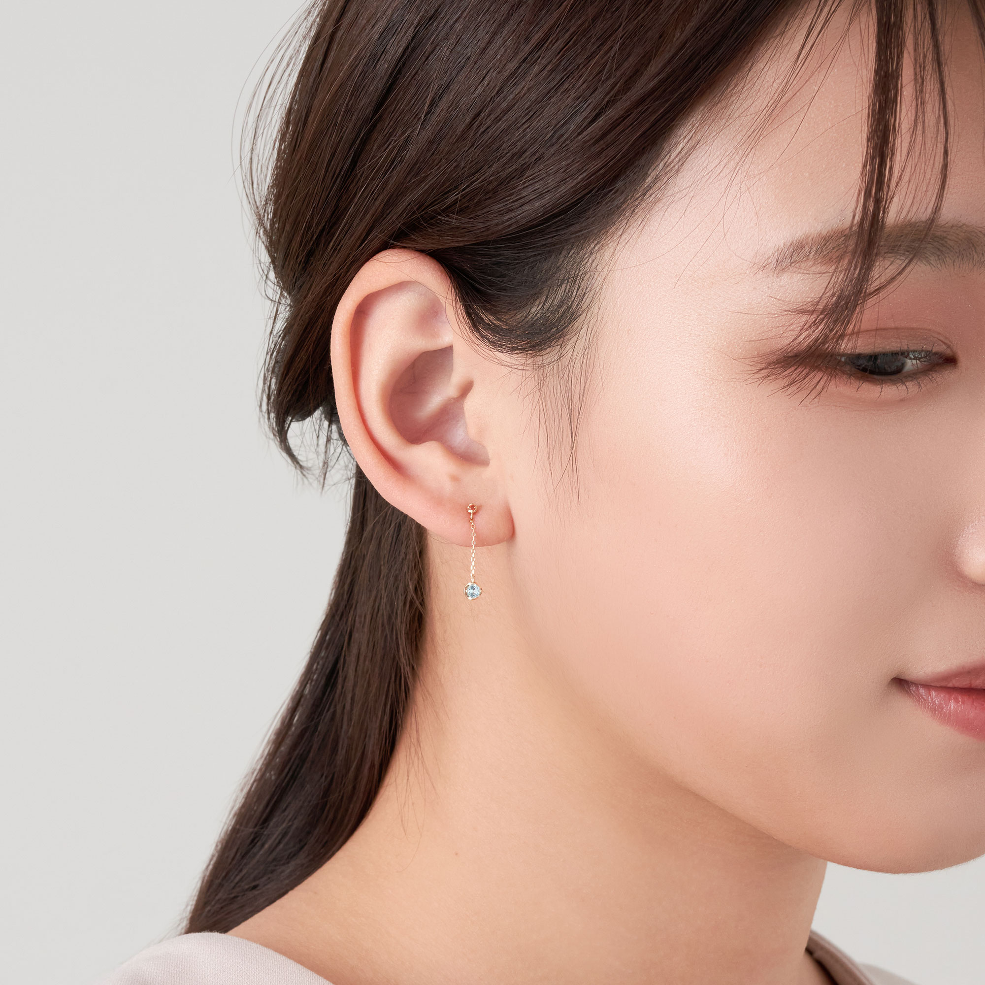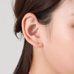 ブルートパーズとオレンジサファイアの輝きが、横顔に印象的なきらめきをもたらすピアス。