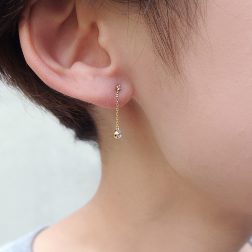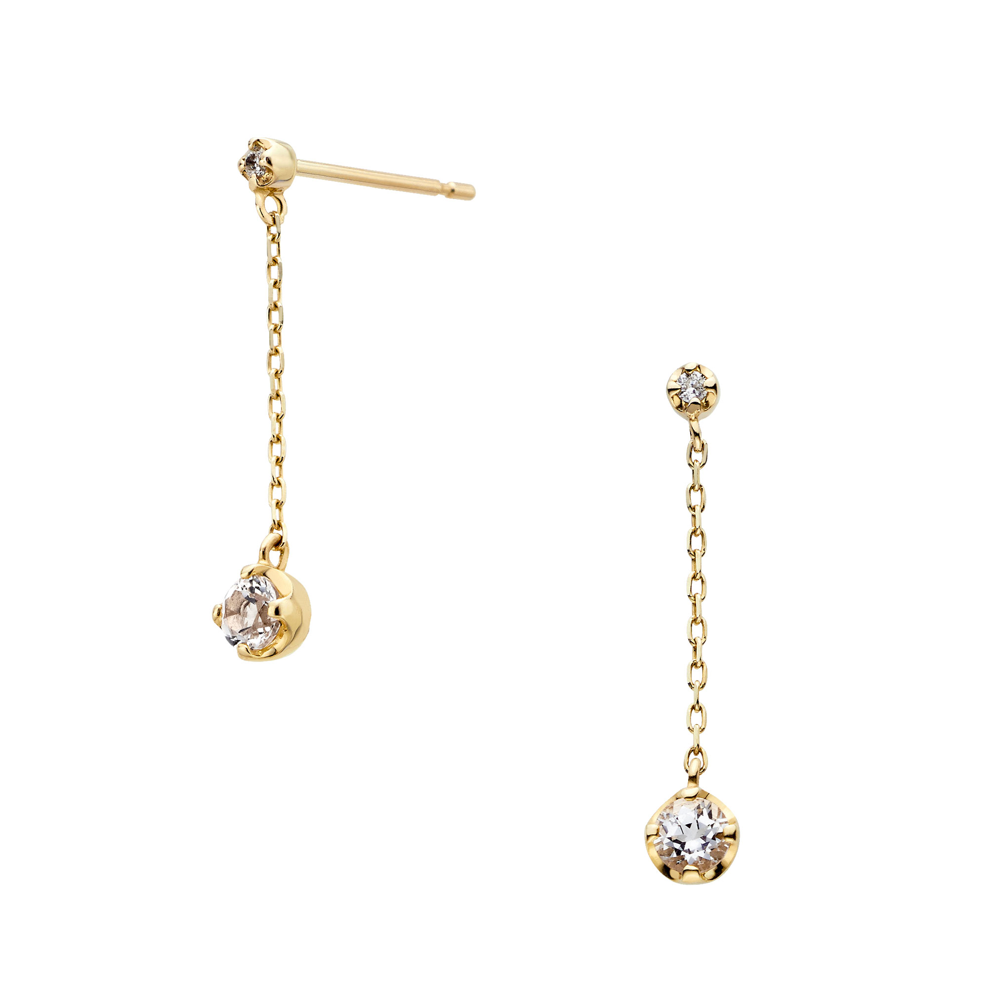 ホワイトトパーズはコロンとしたイエローゴールドの石枠に留められたデザイン。動くたびに揺れ、女性らしさを印象付けます。