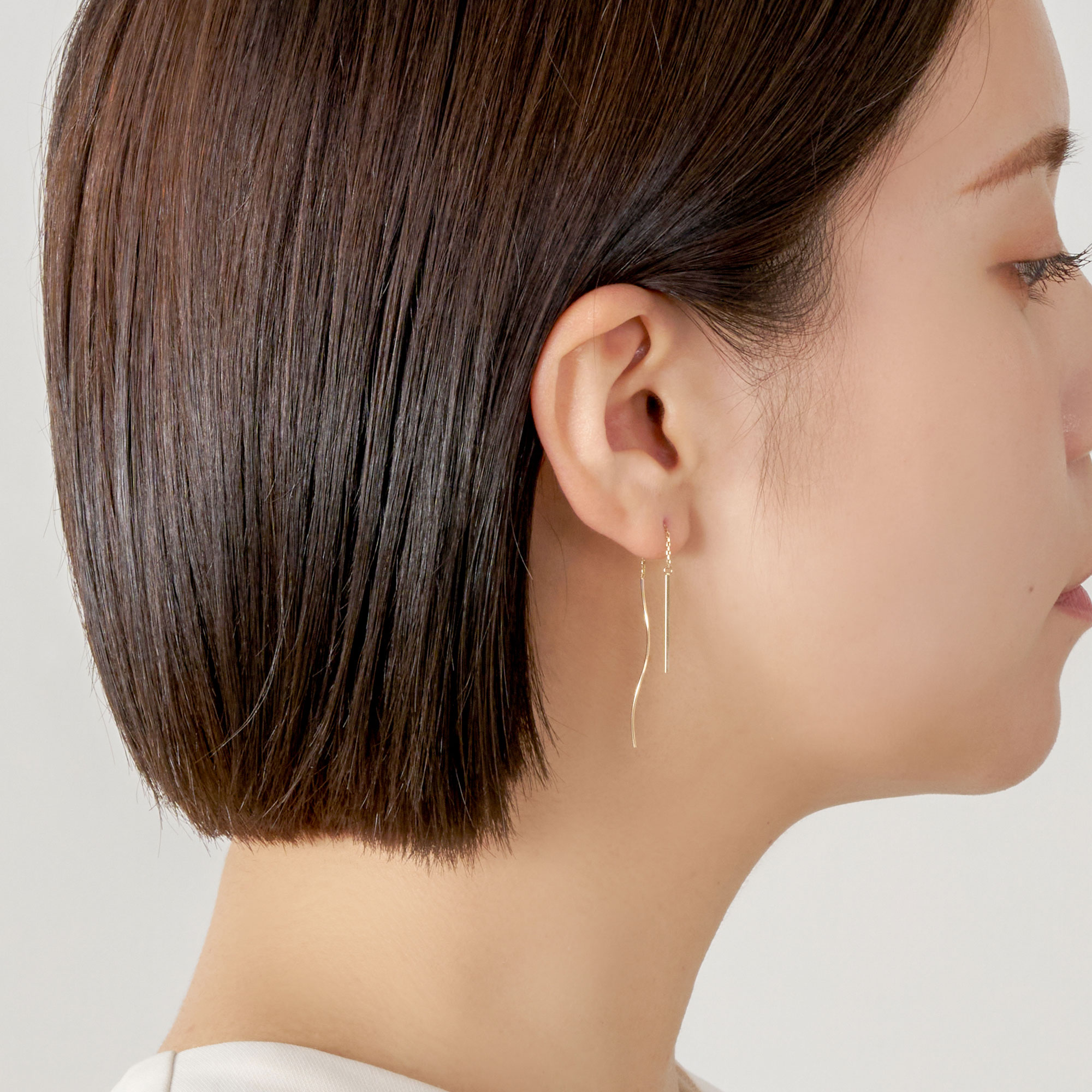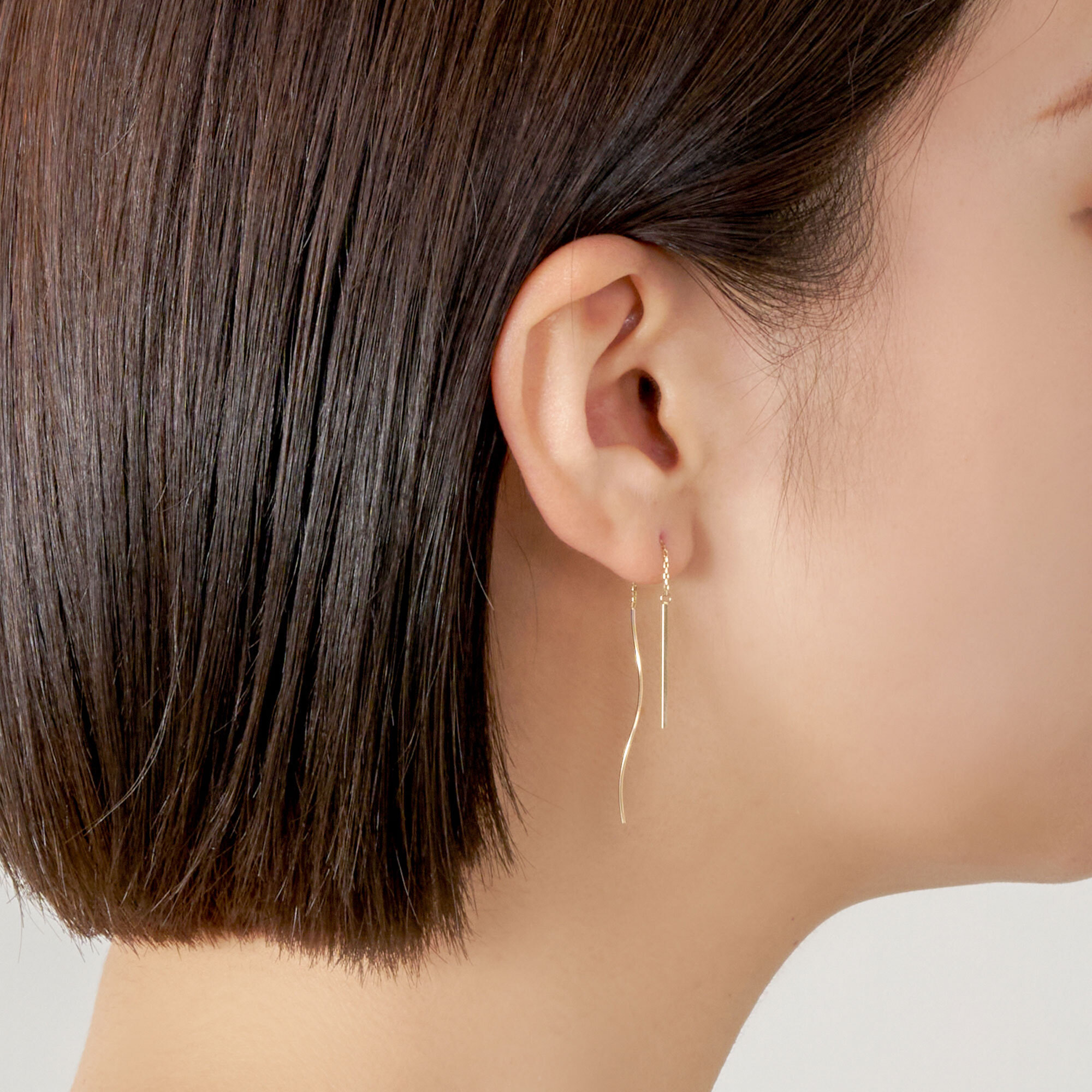 柔らかなカーブとシャープな直線の2つのモチーフが揺れる、つややかな地金感が特徴的なピアス。