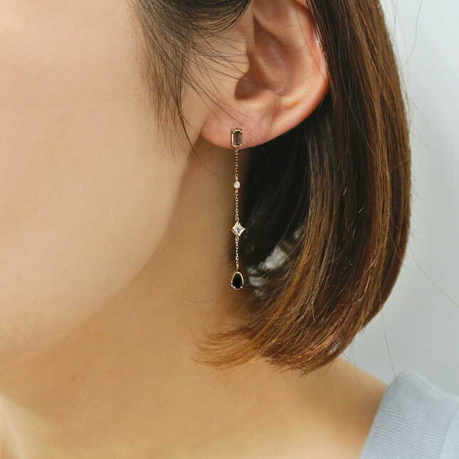 艶めくイエローゴールドに、ホワイトやブラウン、ブラックのシックな色味のカラーストーンが、美しく揺れるロングピアス。