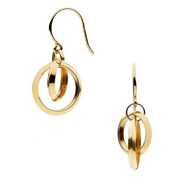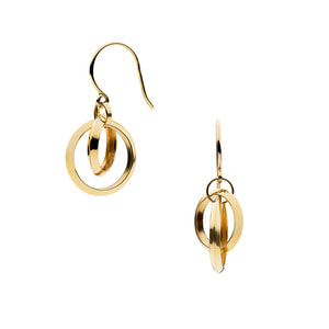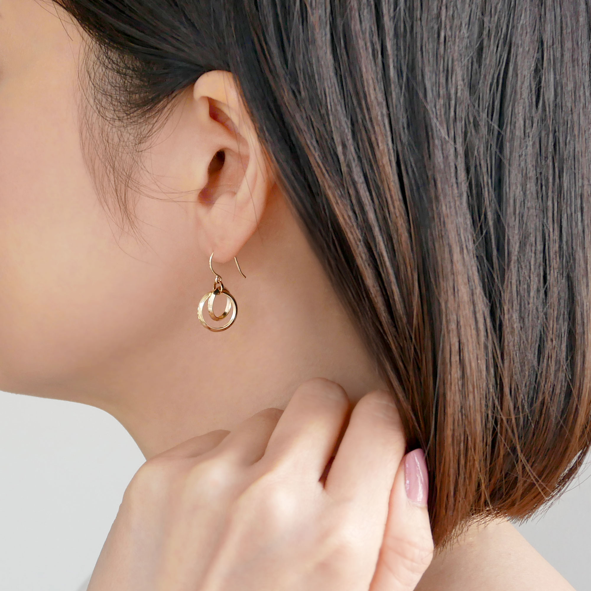 2つのサークルモチーフを組み合わせたスイングタイプのピアス。