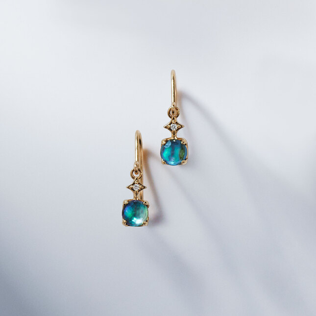 この海の中の風景のような表情を、アバロンシェルとブルートパーズを重ね合わせることで表現。